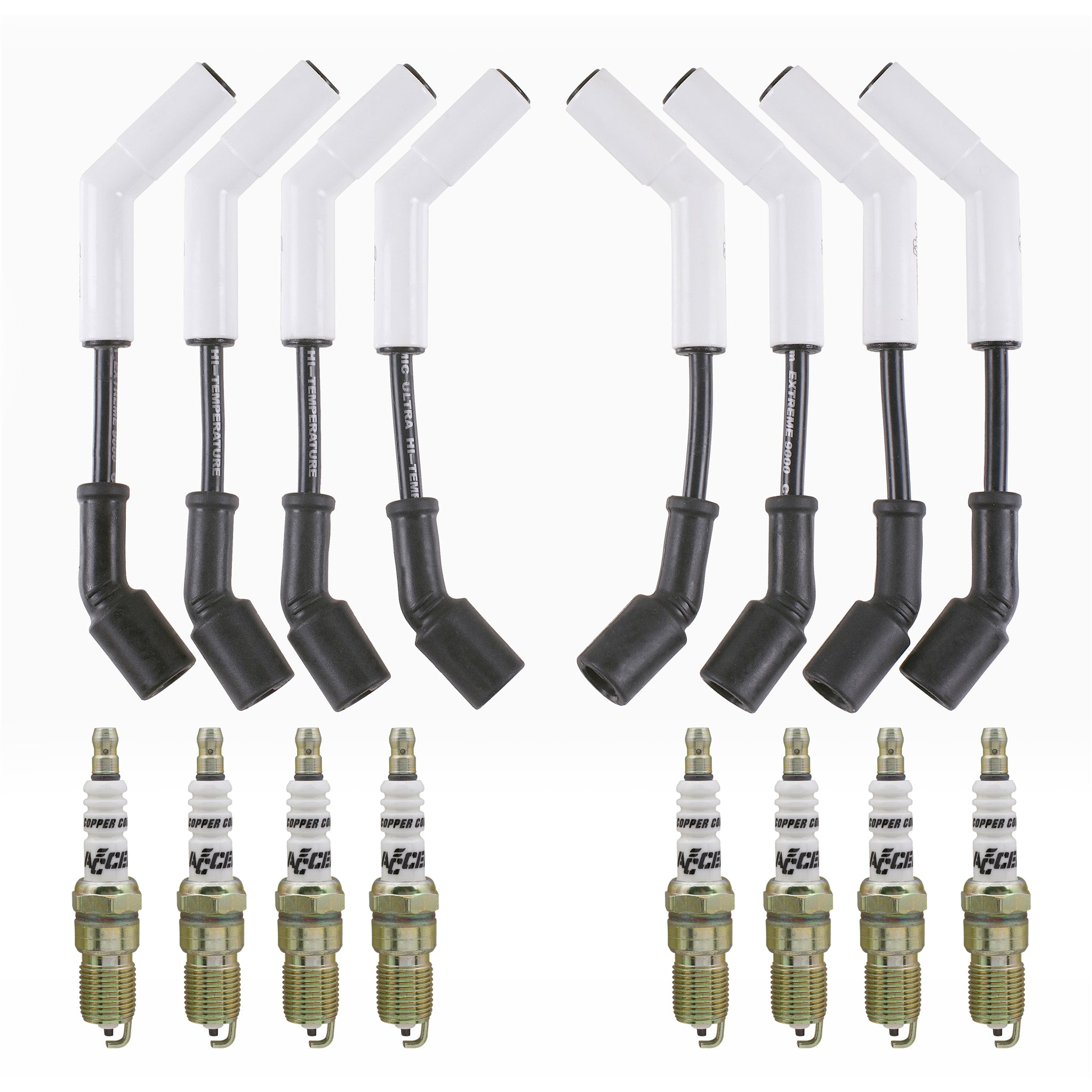 Tune-Up Kit includes custom fit extreme heat ceramic boot ferro-spiral core spark plug wire set & Spark Plugs for GM gen 4 LS3/LS4/LS7 engines. |
