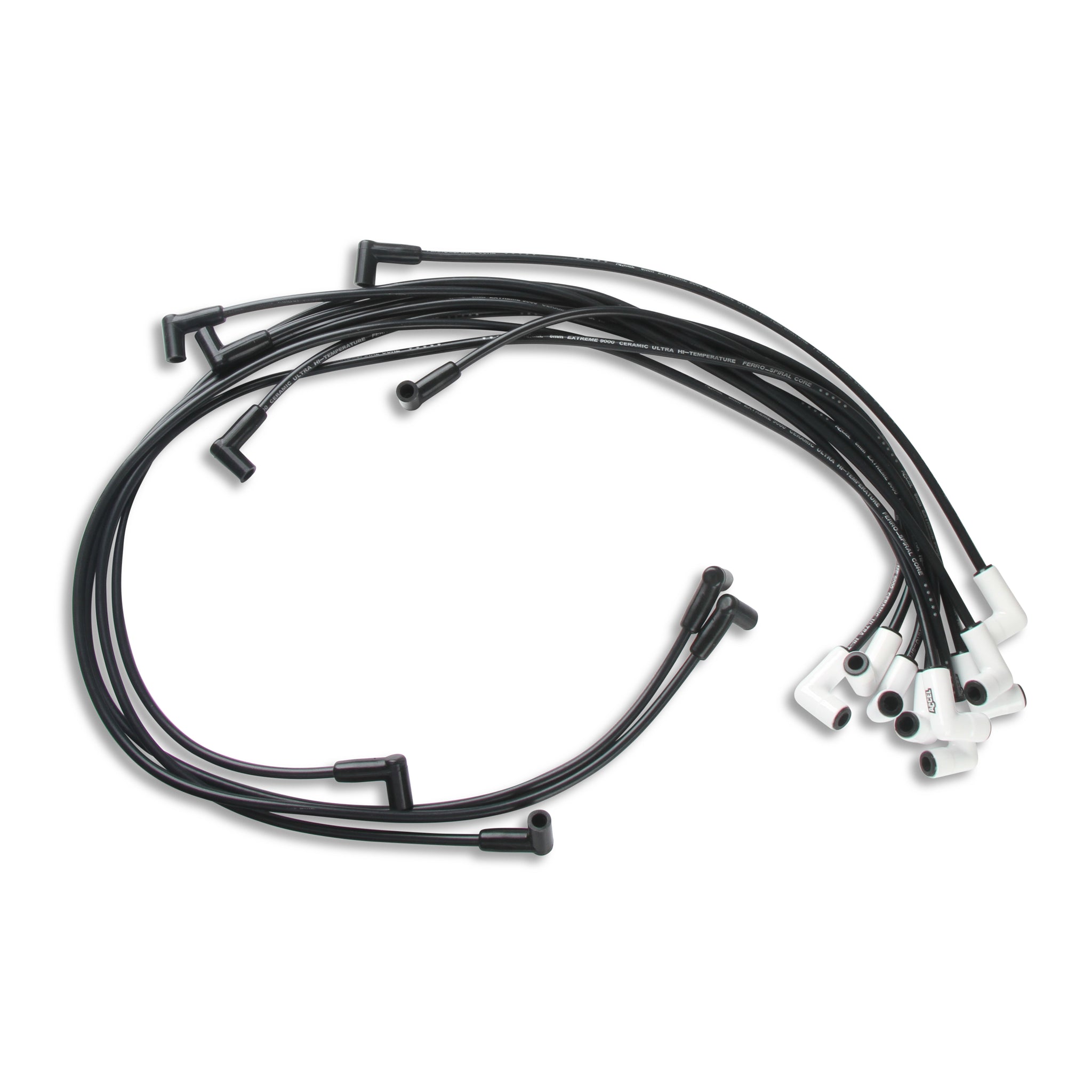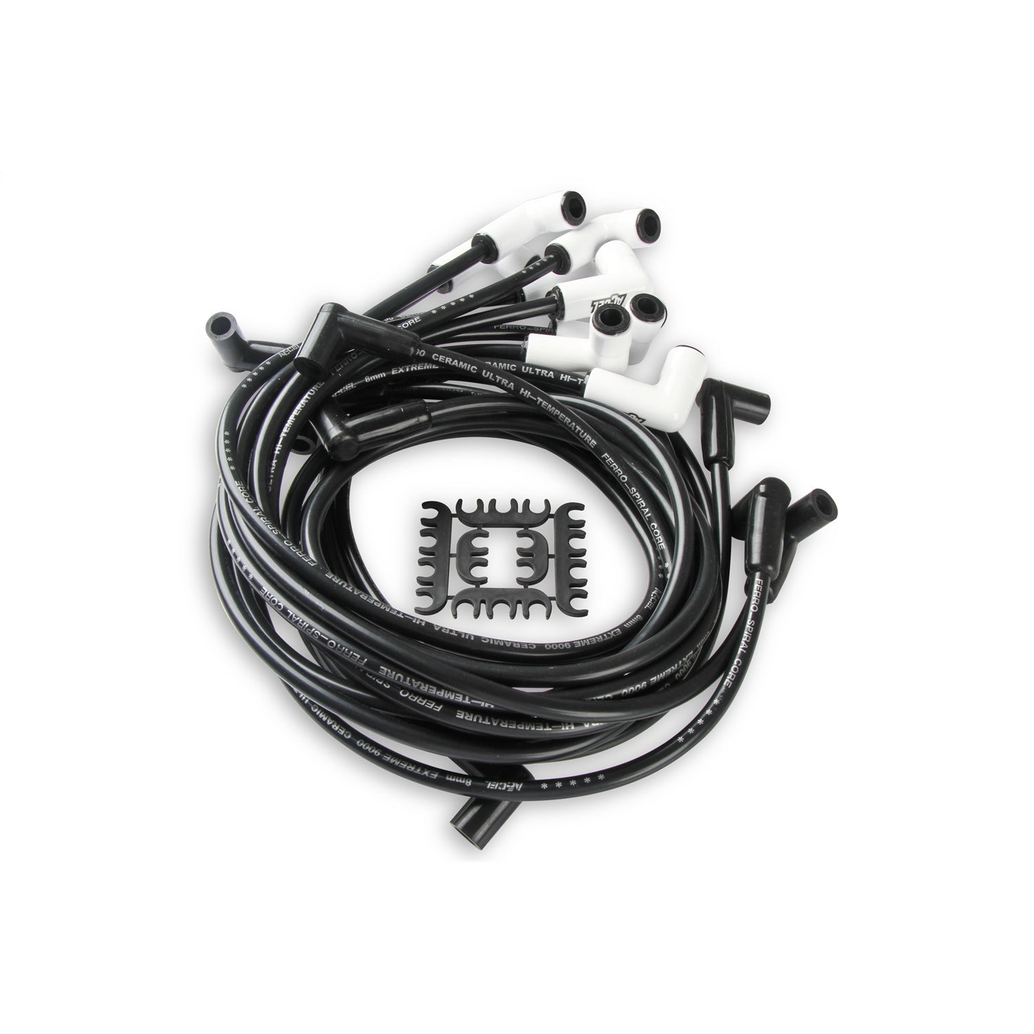 Extreme 9000 Ceramic Boot Spark Plug Wire Set; Fits w/HEI; 8mm Ferro-Spiral Core Wire; 90 Deg. Boot; 500 Ohms Per Foot; Under Valve Cover; Black; |