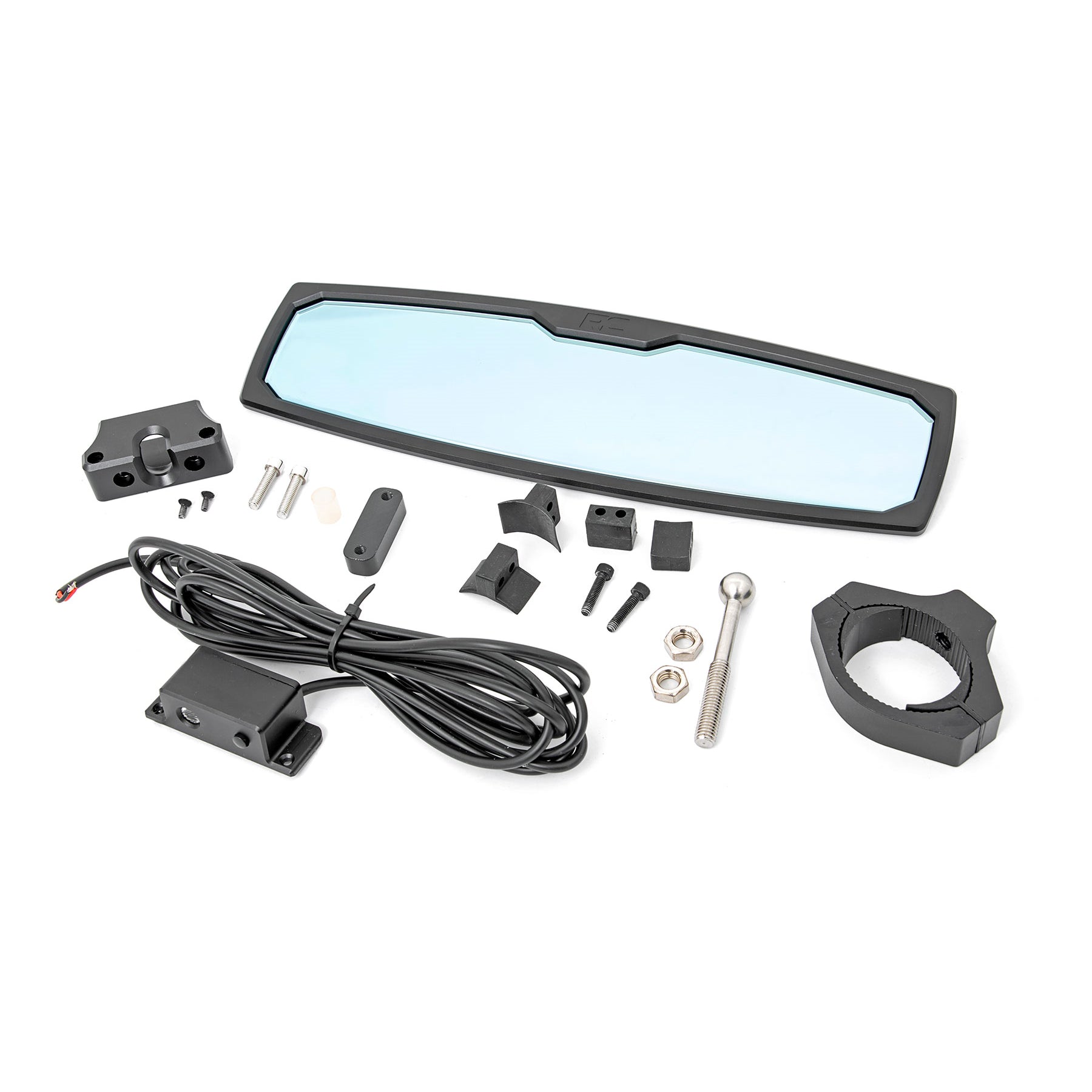 Gain better visibility for your UTV inside the cab and out with Rough Country's Aluminum Rear View Mirror with dome light. The sturdy aluminum frame and reinforced mirror surface is designed for a long lifespan of durability and performance in any off-road environment.Each mirror features a dome light with on/off button and a 2-piece clamp bracket system with optional inserts to fit 1.75 - 2.0 inch diameter roll cages. Once installed, the pivoting mount allows you to quickly adjust the mirror to get the perfect rear-facing angle.Features:UTV Aluminum Rear View with Mirror Dome Light 1.75-2 Inch MountUniversal clamp bracket adjustable from 1.75 - 2 inch BarsCNC Aluminum 6063 housingR4000 curve blue optical mirrorIncludes LED with on/off buttonDimensions: 11.8 Inch x 3.35 InchNotes:Only mounts to a roll cage or other tubular area that is 1.75 - 2.0 inch diameter