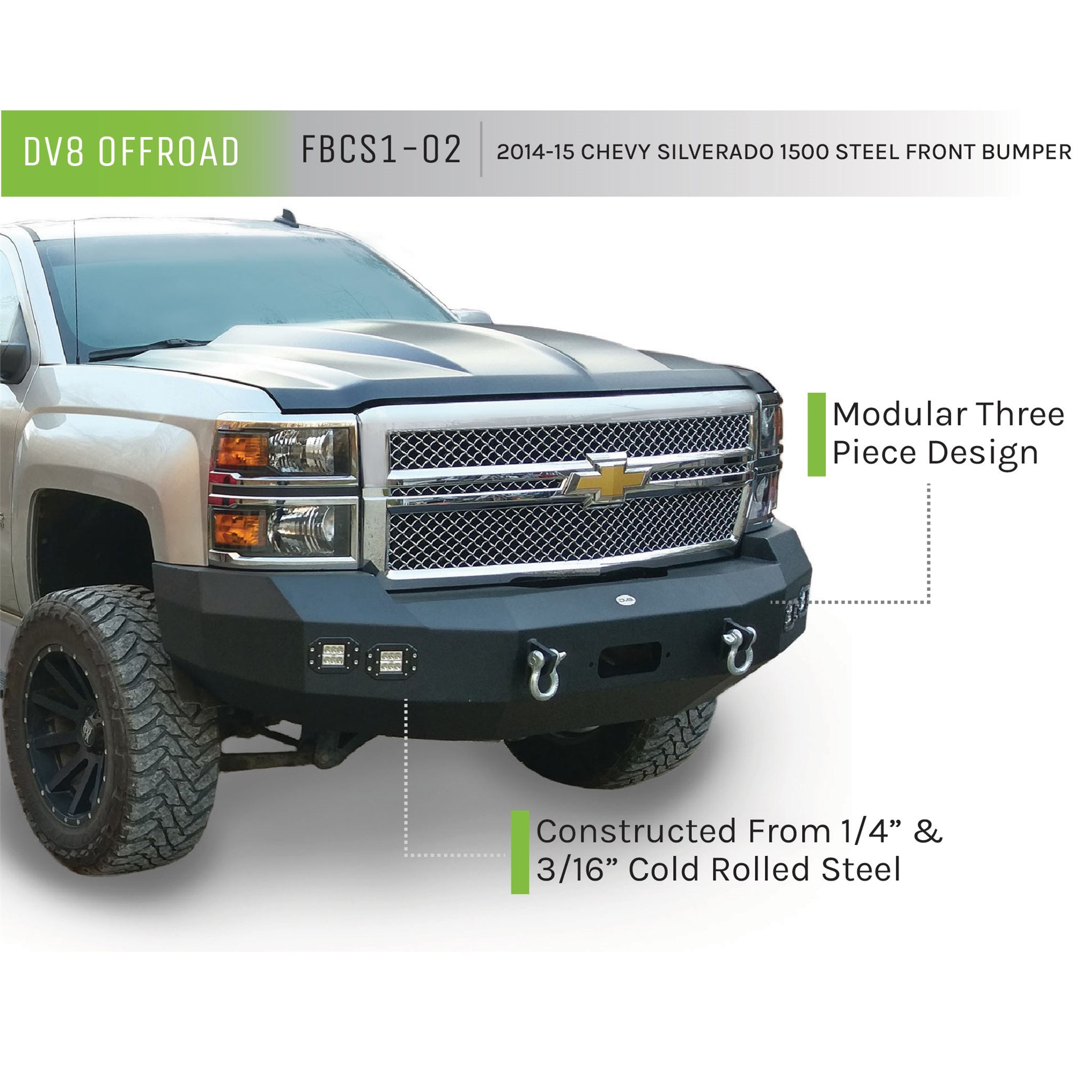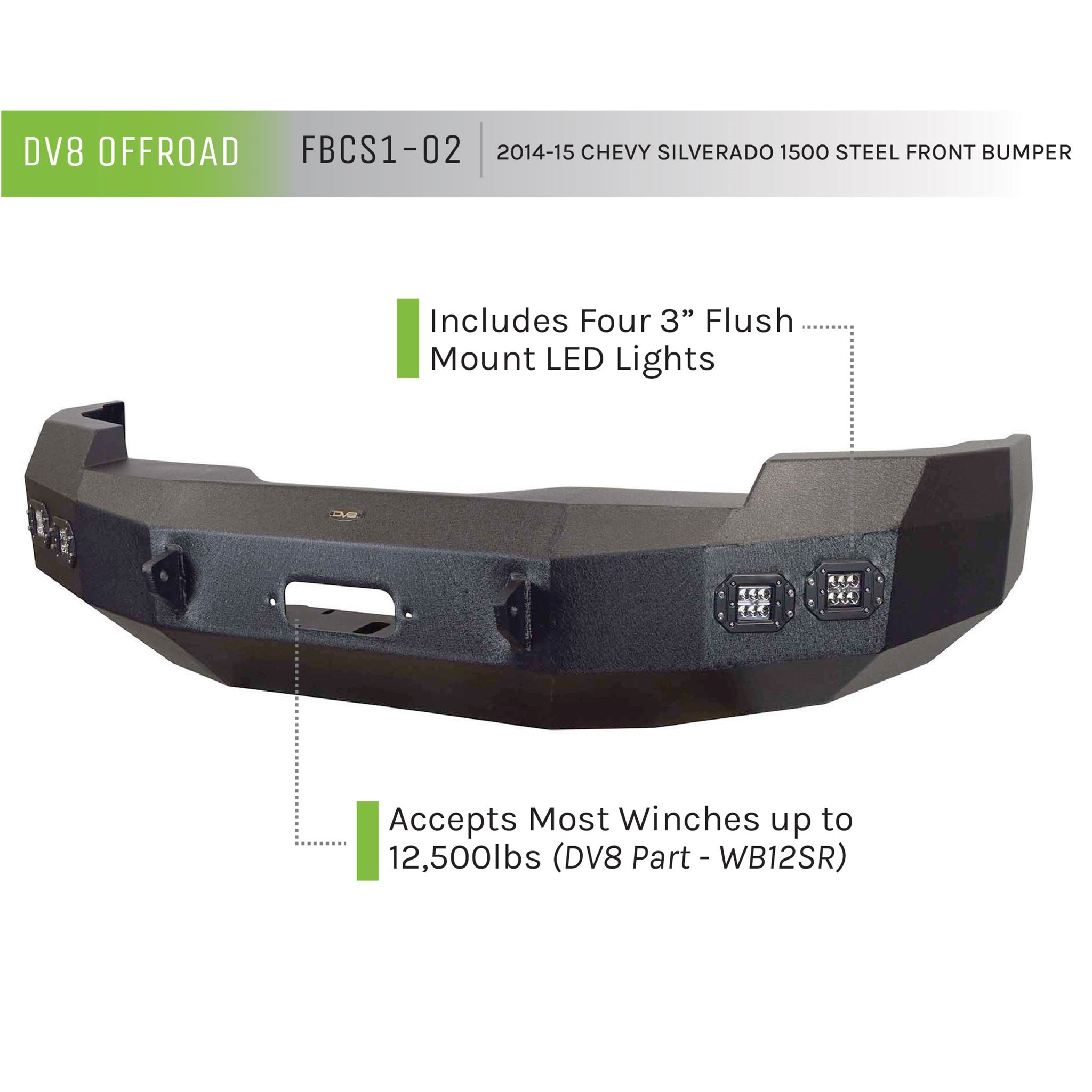 DV8 truck bumpers are made with high tensile strength 3/16 inch steel and reinforced with 1/4 inch steel in key areas which allows them to accommodate up to a 12,500 lbs. winch. We also use a 2 step powder coating process. First the bumper is coated with a thick layer of a proprietary compound for corrosion resistance, then we coat the bumper with our textured black, UV resistant, scratch resistant powder coating. The result is a bumper that will look good and perform well for the lifetime of the vehicle. Key Features: Front Bumper, 2014-2015 Chevrolet Silverado 1500 4.3L V6, 5.3L V8. 1/4 inch and 3/16 inch Steel Construction, 2 Stage Powder Coat Finish, Accommodates Up to a 12,500 lbs. Winch, DV8 No Hassle Warranty, Lights Included.