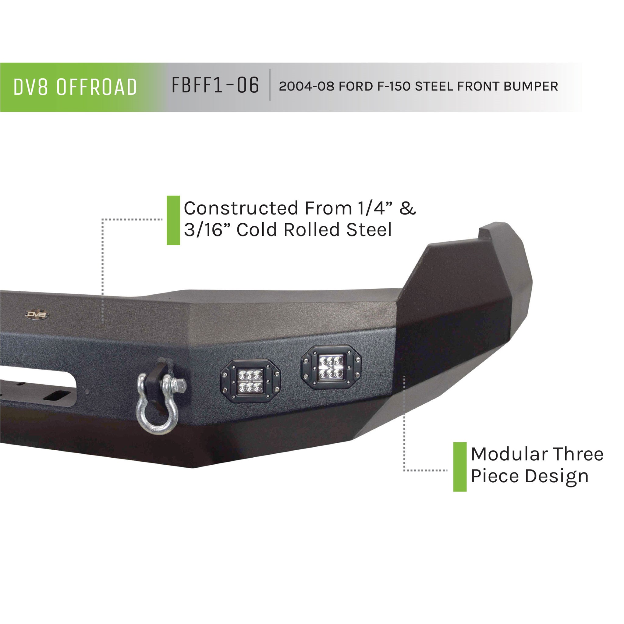 F-150 Front Bumper Winch Ready 04-08 Ford F-150 Black Power coat. DV8 truck bumpers are made with high tensile strength 3/16 inch steel and reinforced with 1/4 inch steel in key areas which allows them to accommodate up to a 12,500 lbs. winch. We also use a 2 step powder coating process. First the bumper is coated with a thick layer of a proprietary compound for corrosion resistance, then we coat the bumper with our textured black, UV resistant, scratch resistant powder coating. The result is a bumper that will look good and perform well for the lifetime of the vehicle. Key Features: 1/4 inch and 3/16 inch Steel Construction, 2 Stage Powder Coat Finish, Accommodates Up to a 12,500 lbs. Winch, DV8 No Hassle Warranty.