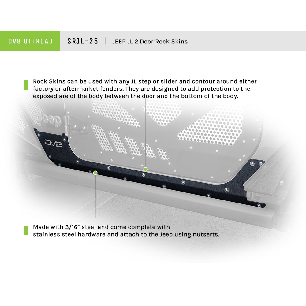 SRJL-25 2018+ Jeep Rock Skins (2 Door Only). The DV8 Offroad SRJL-25 Rock Skins can be used with any JL step or slider and contour around either factory or aftermarket fenders. They are designed to add protection to the exposed are of the body between the door and the bottom of the body which is one of the most susceptible areas on any Jeep for trail damage. The SRJL-25 come complete with stainless steel hardware and attach to the Jeep using nutserts. Key Features: 2018+ Jeep Rock Skins (2 Door Only), Made with 3/16 inch steel, Powdercoated DV8 Textured Black, Protect a very vulnerable area of the JL, Can be used to cover trail damage, Attach securely using nutserts.