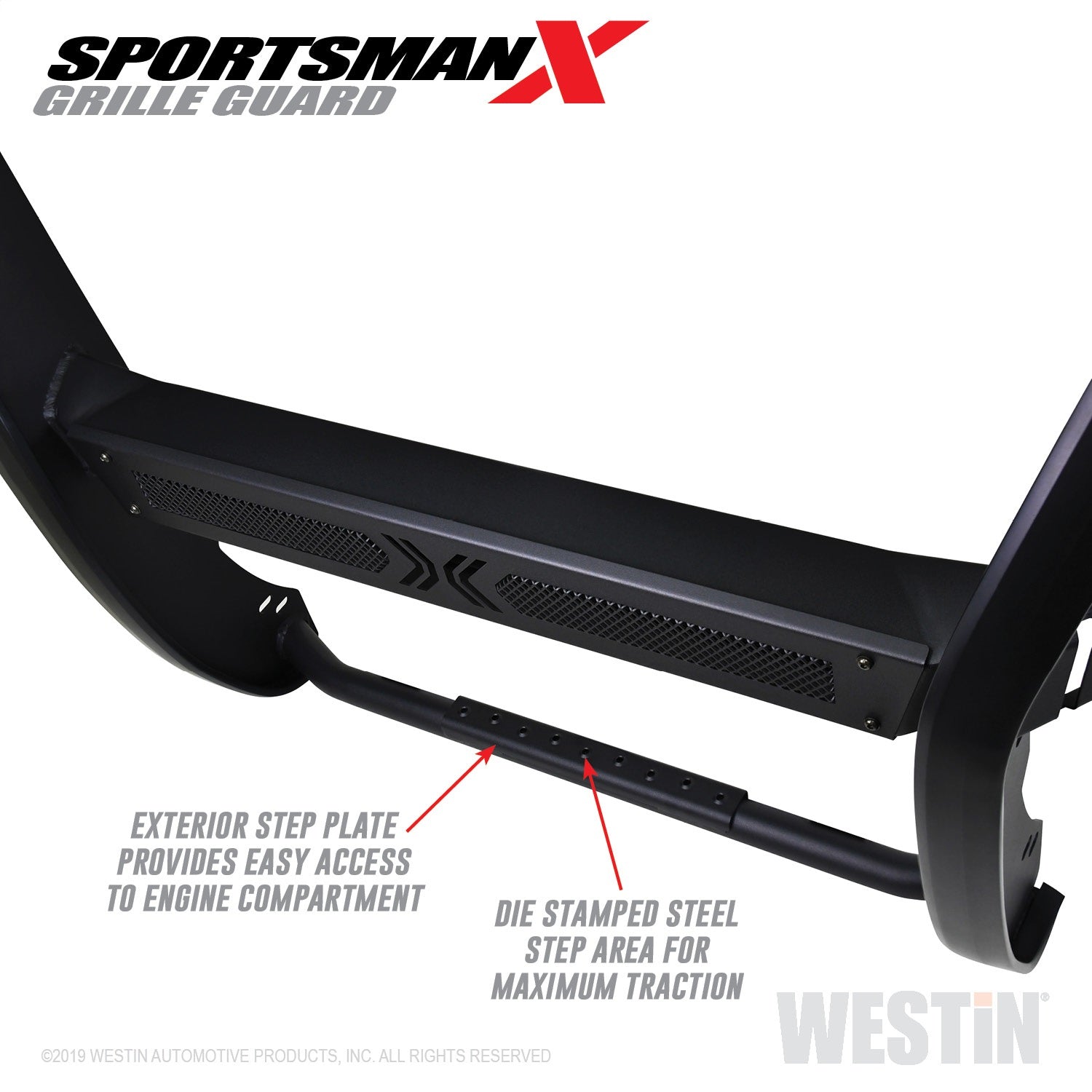 Westins Sportsman X Grille Guard effectively combines aggressive styling with heavy duty front end protection. Engineered to provide both great looks and performance, Sportsman Xs unique design compliments todays larger grille designs, and is available to fit most full and mid size truck applications. Sportsman X has an optional detachable mesh panel (sold separately) which is specifically designed to fit the opening in the center section of Sportsman X Grille Guard, or can be removed to accommodate the flush mounted 26" dual row LED light bar (sold separately). A smaller removable mesh panel designed for the factory sensor location opening is included as standard with Sportsman X. For specific Chevy and Dodge/RAM applications a Sportsman X Sensor Kit (sold separately) is available. An exterior step plate is located on the 1-5/8" bottom tube to provide easy access to the engine compartment. Built with heavy duty 2-1/4" upright rubber strips and 1- 5/8" outer tubes, Sportsman X Grille Guard is designed to provide protection and style for years to come.