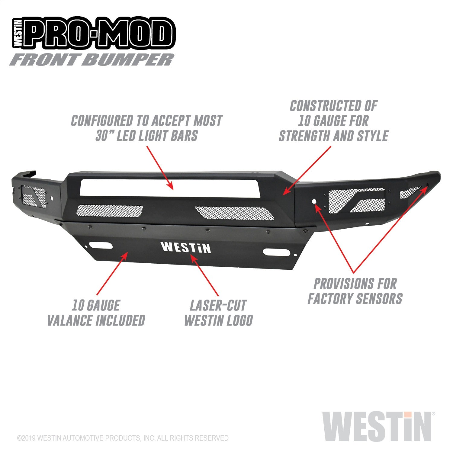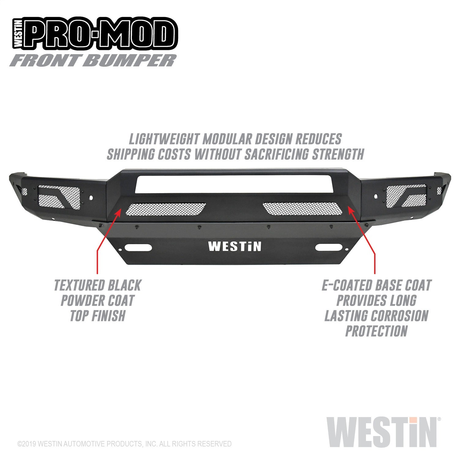Westins Pro-Mod Front Bumper combines enhanced vehicle protection, with great looks. Pro-Mods revolutionary lightweight modular design is uniquely engineered with outrigger reinforcement brackets to provide maximum front end protection without compromising on strength, integrity or durability. The "high and tight" bumper profile creates a greater approach angle, which significantly improves off-road driving capabilities. The lightweight design also requires smaller shipping packages which dramatically reduces shipping costs. Pro-Mod bumpers feature a textured black finish with an e-coated base coat, providing long lasting corrosion protection from the elements. Once you see the Pro-Mod Front Bumper, the choice becomes obvious.