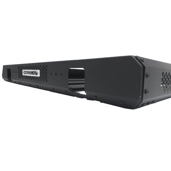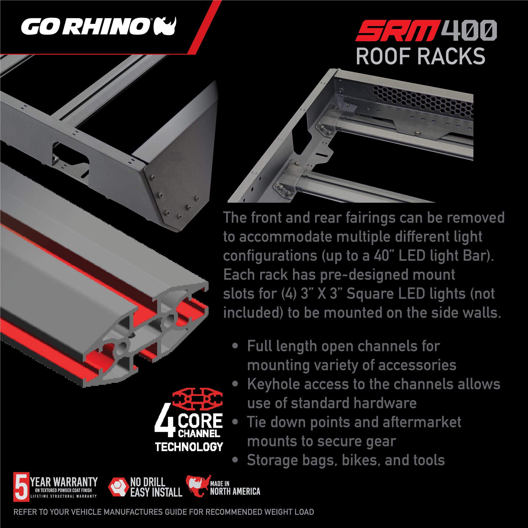 The Go Rhino SRM400 Roof Rack is a basket-style roof rack with removable front and rear fairings, which allow it to be customized to fit oversized items, such as lumber, kayaks or surfboards. It is equipped with Go Rhino's exclusive 4-CORE aluminum bars, the extruded track system that works with any 1/4x20 hex bolt and provides unlimited mounting options for gear and trail tools. Integrated side light mounts and hole patterns offer a variety of supplemental lighting options. The SRM400 is 52 inches wide, 68 inches front-to-back, and can be mounted on any vehicle's OE crossbars with the included Rhino Clamp system. Other mounting options are also available. SRM 400 come with a Limited Lifetime warranty on materials and construction and a 5 year warranty on the Textured Black Finish. |