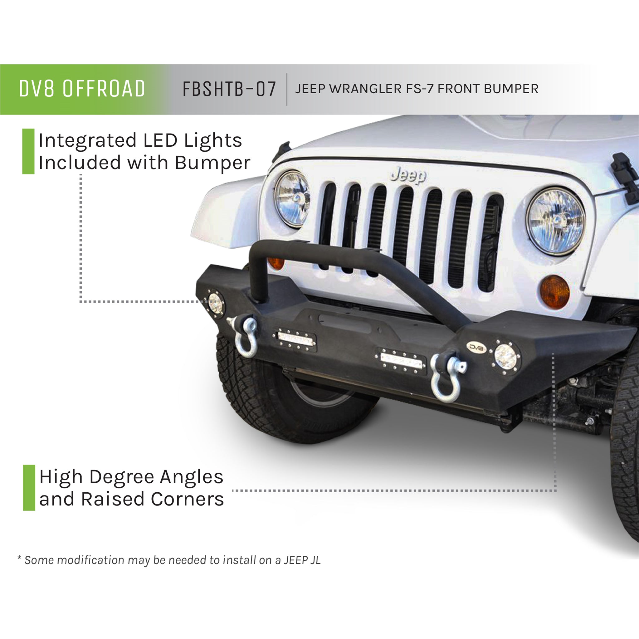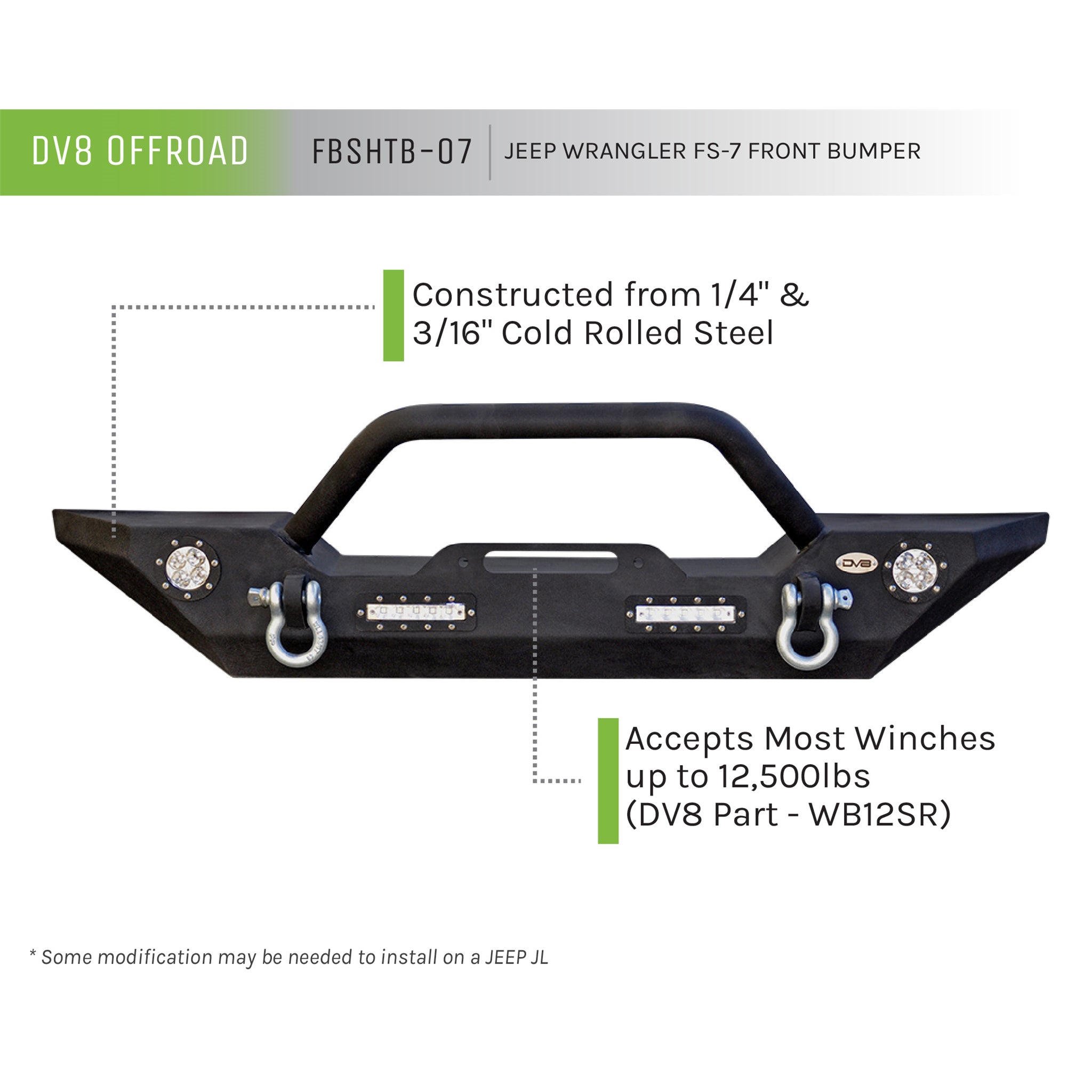 DV8 Offroad bumpers are all trail tested and proven designs! 3/16 inch and 1/4 inch cold rolled steel, .120 wall tubing, high degree angles and raised corners, light tabs and Solid D-ring mounts w/ rings included. All bumpers come in textured black powdercoating. This style is a midsize bumper with 4 led lights built in and a bull bar. For 2007-2018 Jeep Wrangler all models. Easy installation, no modifications needed, lights and hardware included.Features:Midsize Front Bumper.120 Wall Tubing3/16 inch and 1/4 inch Cold Rolled SteelSolid D-ring Mounts with Rings IncludedTextured Black PowdercoatHardware IncludedIncludes: 4 LED Lights built in and a Bull BarFits 2007-2018 Jeep WranglerFits 2018 Jeep Wrangler JLSold as EachLights Included