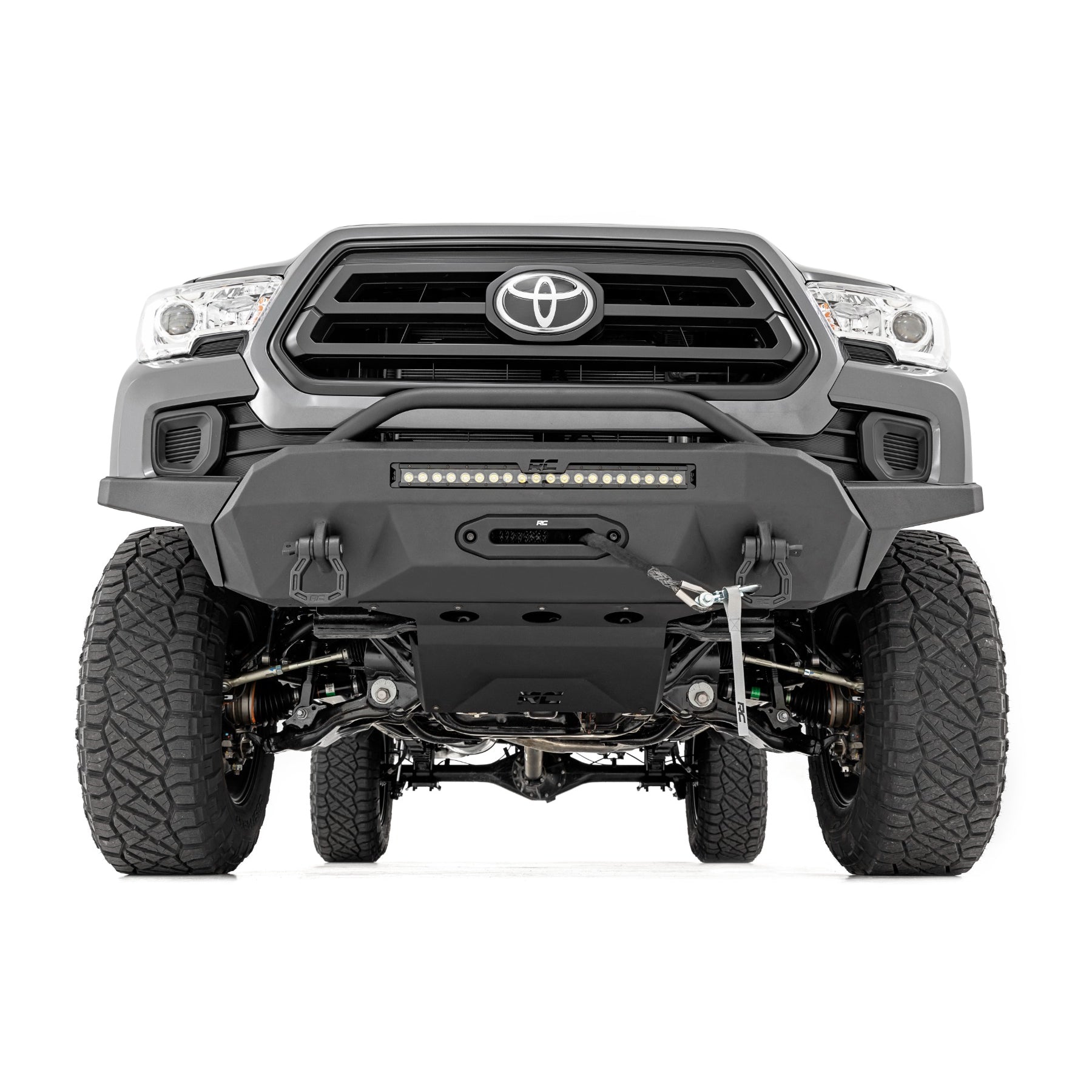 Innovative Design at a Fraction of the Cost! Give your front-end a unique look at a fraction of the cost with Rough Country's DIY Bumper Kit. These modular bumper kits ship unassembled giving you the opportunity to build your own bumper while saving a TON of money compared to pre-assembled aftermarket bumpers. Weld it together, paint it, and bolt it up to totally transform your truck with this amazing off-road-ready bumper!Modular Design. Rough Country's DIY Bumper Kit is modular, letting you pick and choose the options you prefer. Each bumper features trim plates and mounting options that allow you to run a series of LED lights for impressive illumination and can accommodate a recessed winch for off-road recovery. For a more classic look, simply use the provided trim panels for a sleeker appearance. Boasting impressive angles this innovative design allows for a high approach angle allowing much-needed clearance for facing the trails!Installation. Requiring welding and cutting, an estimated timeframe of 8-10 hours is suggested to complete the installation process. With the included step-by-step instructions this high-quality unit can be assembled in your garage and installed at home!Lifetime Replacement Warranty. Rough Country's 3.5 Inch Knuckle Kit is backed with a lifetime replacement warranty towards manufacturer defects. As such, the product is protected from structural and workmanship damage after the date of purchase. With our industry-leading warranty give yourself peace of mind when using Rough Country's Suspension products!Features:Front Bumper High Clearance 9500 Lb Pro Series Winch Synthetic Rope 16-22 Toyota Tacoma 4WDAn eye-catching bumper at a fraction of the cost.Modular so you can select the exact configuration you prefer.Includes trim panels for optional LED light.Includes winch mounting plate.Durable black powder coat.Includes D-Ring Mounts and D-Rings.Notes:Rough Country's bumper was designed to accommodate Rough Country's Pro Series winches.Use of stinger bar may interfere with adaptive cruise control/lane departure sensors.Drilling Required.Trimming of factory plastic bumper required.Must use Rough Country Hawse Fairlead.