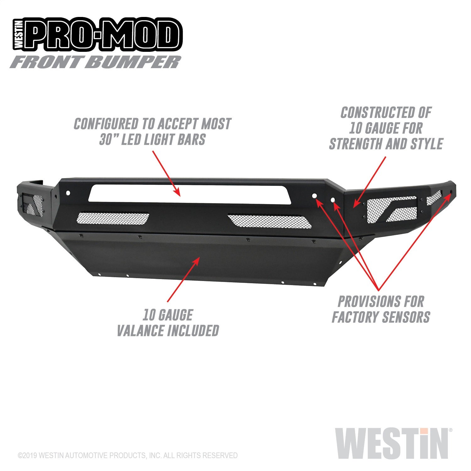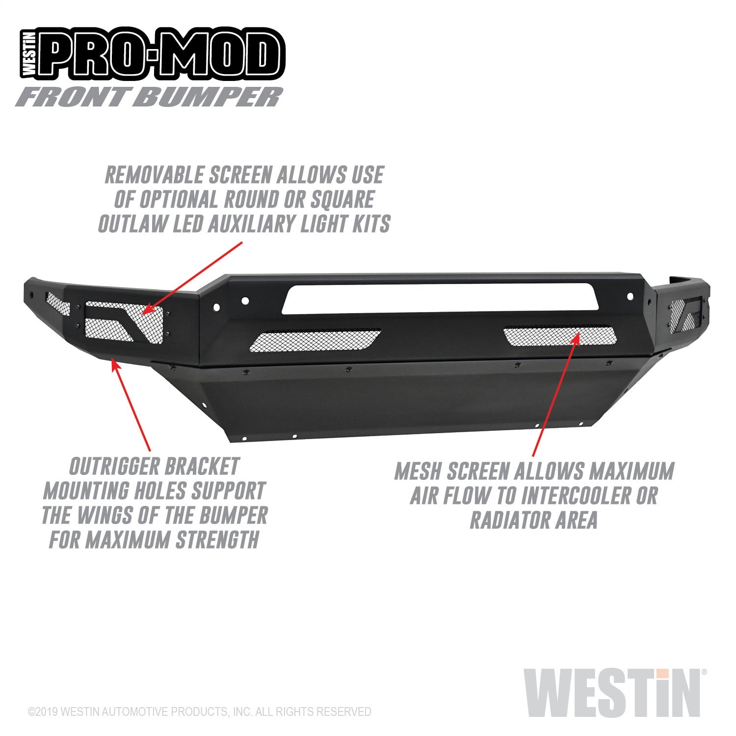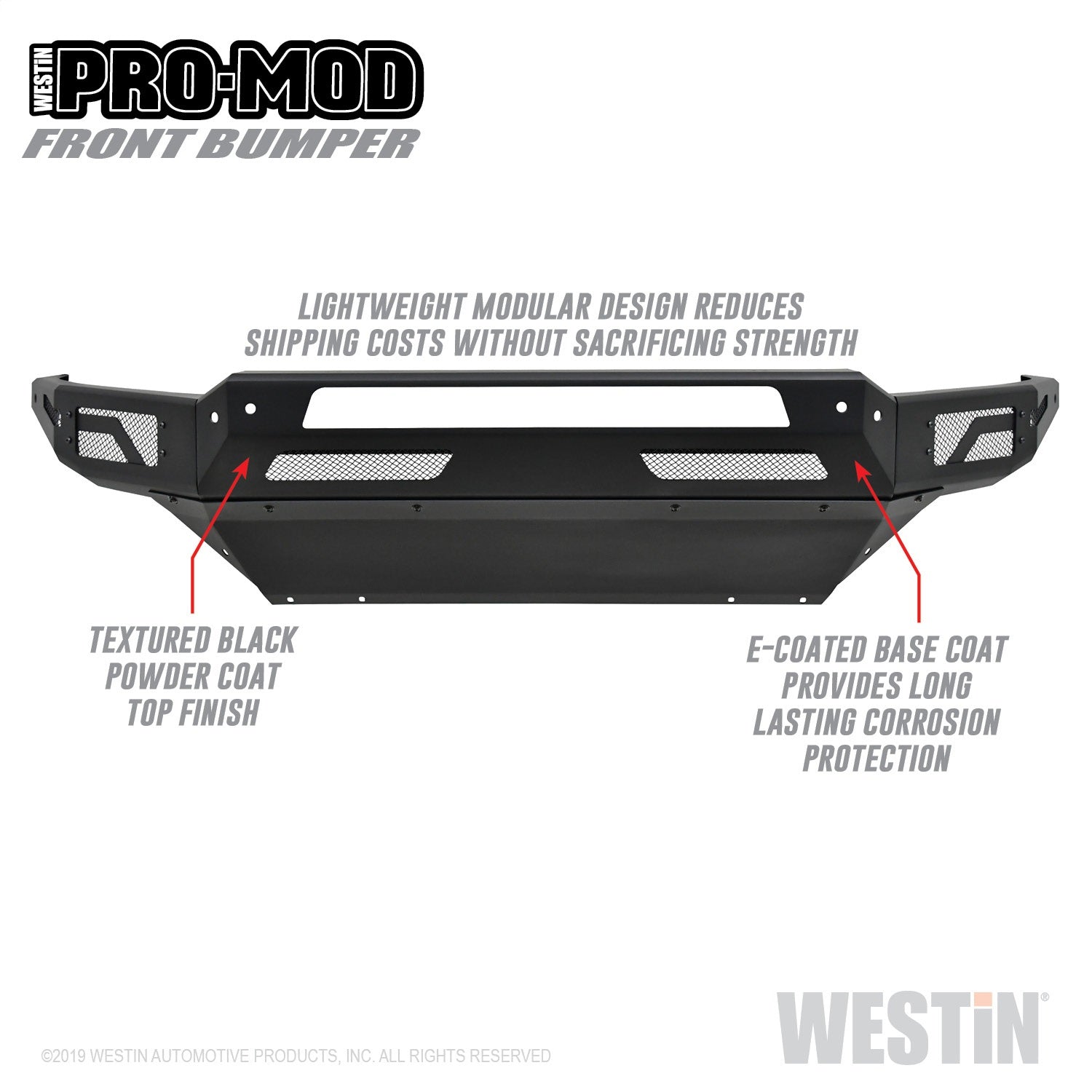 Westins Pro-Mod Front Bumper combines enhanced vehicle protection, with great looks. Pro-Mods revolutionary lightweight modular design is uniquely engineered with outrigger reinforcement brackets to provide maximum front end protection without compromising on strength, integrity or durability. The "high and tight" bumper profile creates a greater approach angle, which significantly improves off-road driving capabilities. The lightweight design also requires smaller shipping packages which dramatically reduces shipping costs. Pro-Mod bumpers feature a textured black finish with an e-coated base coat, providing long lasting corrosion protection from the elements. Once you see the Pro-Mod Front Bumper, the choice becomes obvious.
