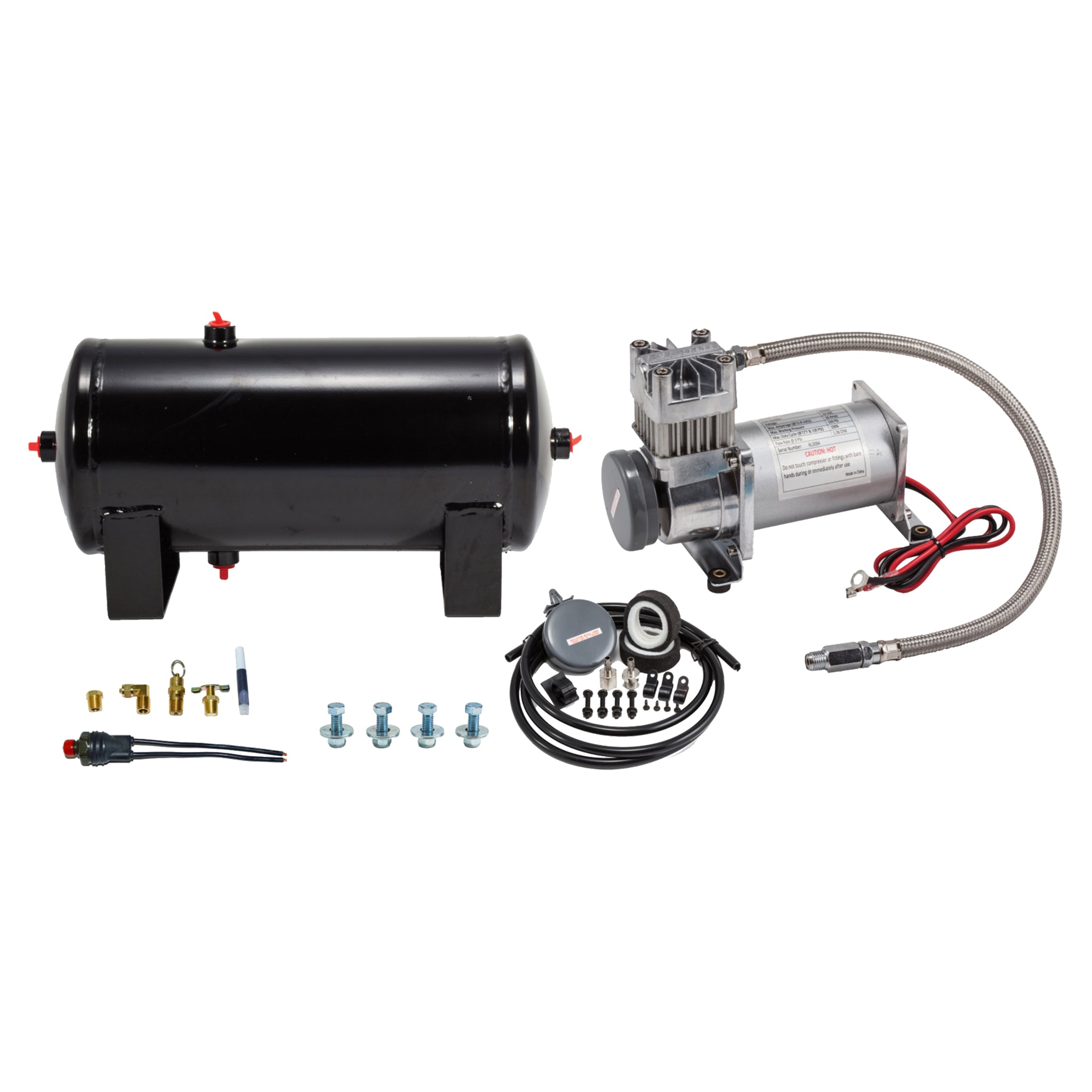 150 PSI sealed compressor;1.5 gallon air tank (Five 1/4" NPT ports), all steel construction, manufactured to SAE J10 and FMVSS 121 standards. Made in the USA.; All necessary fittings and mounting hardware included;110/145 PSI pressure switch included; "Snorkel" air intake relocation kit included |