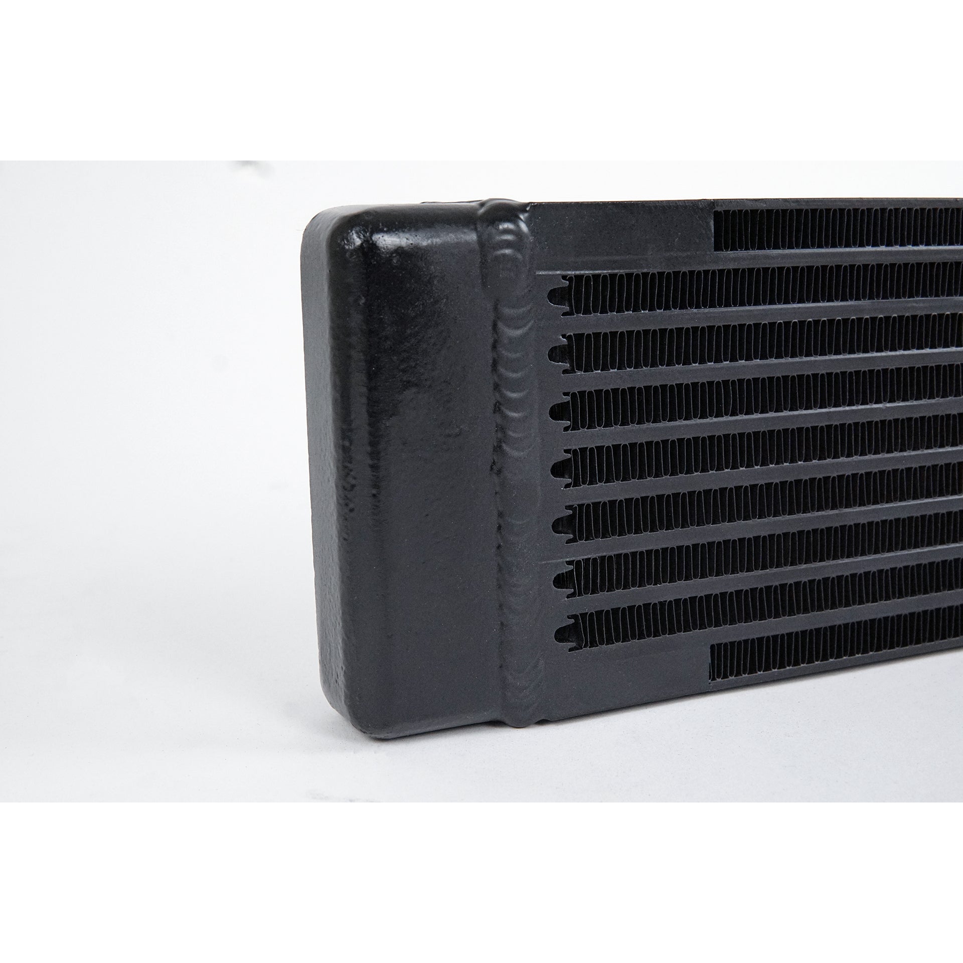 This Dual-Pass Oil Cooler can be mounted horizontally, vertically, as well as parallel to the ground (provided that the oil cooler has proper air-flow). The CSF #8201 Oil Cooler has custom end tanks with a 45' front angle, allowing it to fit flush inside '73-style RS bumpers. The fittings are pointed straight back. For best airflow and highest performance, CSF recommends cutting the front tub to allow for proper air flow, exiting behind the oil cooler and underneath the vehicle. Cutting the front tub will also give clearance to allow adding a rear fan shroud to pull more air through the cooler at slower speeds or while idling. In universal applications these oil coolers are commonly utilized for engine oil, transmission oil, power-steering fluid, and differential fluid, plus can be used as a water heat exchanger.The unique design of CSF's oil cooler line has distinct advantages over conventional style oil coolers (plate-type/stacked oil coolers). The oil coolers can be placed in tighter spaces or different areas of the vehicle that don't have much vertical surface area. Longer rectangular sizes can also help with avoiding the stacking of too many coolers which may cause airflow issues to other components in the cooling system. Inlet/outlet port placement is much easier to route oil lines. Typical oil cooler lines have to be routed from different/opposite ends of the cooler often facing up or down. Usually one line has to run across from one side of the cooler to the other to then be routed together to the feed/return connection of the oil system. The CSF oil coolers are much more robust, durable, and can withstand a higher peak burst rate. This allows the cooler to be mounted in areas that might get high debris (front fascia, diff cooler, side vents, etc ). The CSF oil cooler is designed to withstand a tremendous amount of vibration and debris.