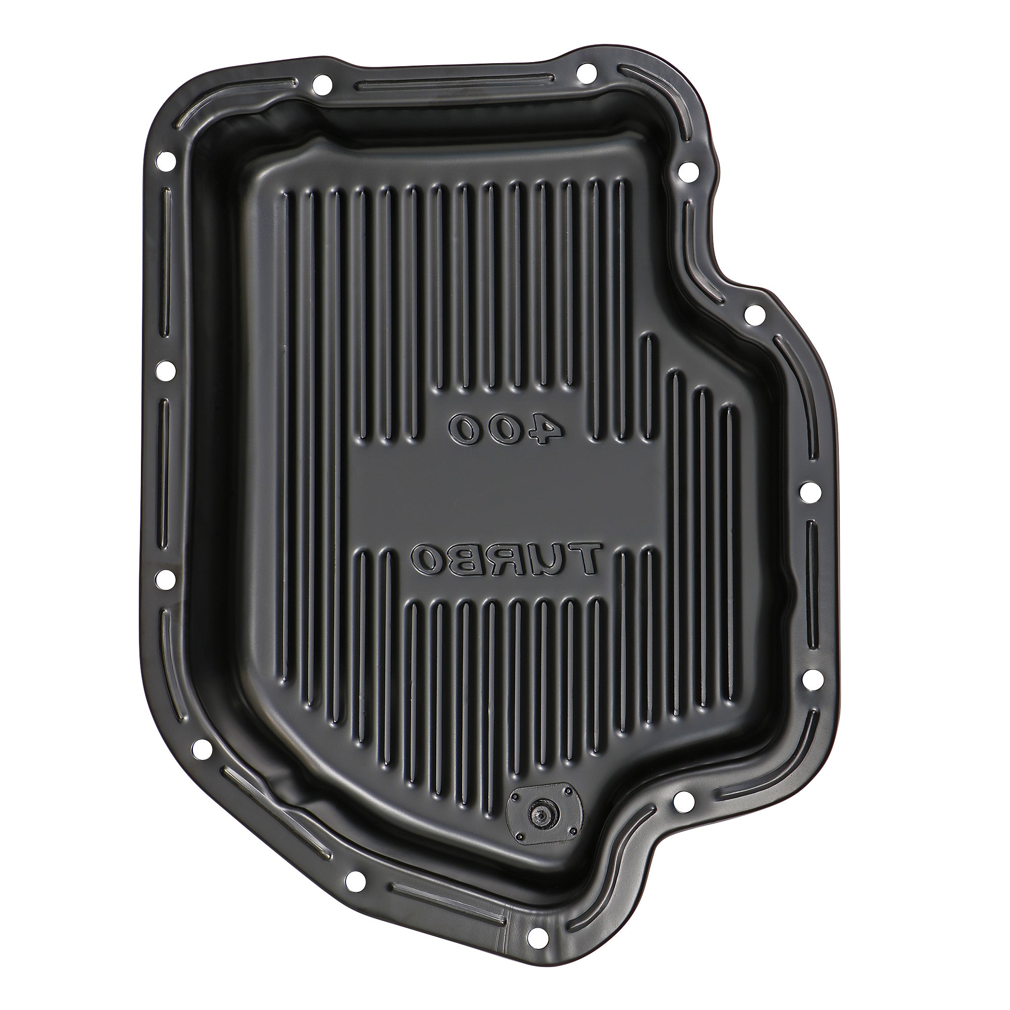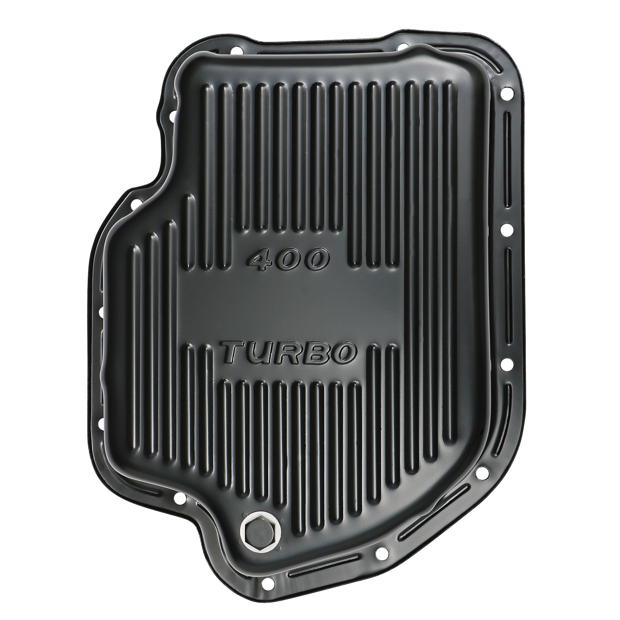 BLACK Steel, FINNED Bottom, TH400 (Turbo 400) Transmission Pan; EXTRA CAPACITY (+1.5 qts.); 3 in. Pan Depth. |