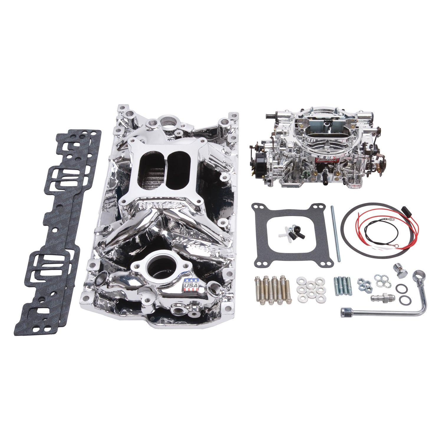 Edelbrock Single-Quad Manifold and carb kit Small-Block Chevy with Vortec Heads. With a Manifold and Carb Kit, it's easy to upgrade your induction system with the best combination of Edelbrock proven performance and looks in a single box. |