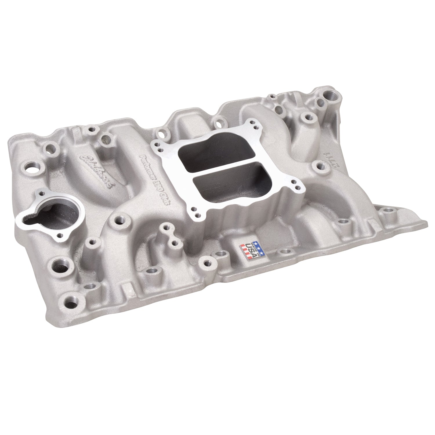 Edelbrock part #2711 Performer Oldsmobile 350 intake manifold is designed for 1964-85, 307-330-350-403 c.i.d. Oldsmobile V8 applications. For non-EGR, the #2711 manifold comes with a universal pad to fit most carburetors with electric chokes. Will fit 1980-1/2 to 1985 307 c.i.d. V8's with 5A heads (casting #3317). Edelbrock's Patented Dual-plane, low-rise design with a 180-degree firing order greatly improves torque over a wide rpm range for excellent throttle response from off-idle through 5500rpm. This Performer intake manifold is ideal for passenger cars, trucks, 4x4s, tow vehicles and RVs.