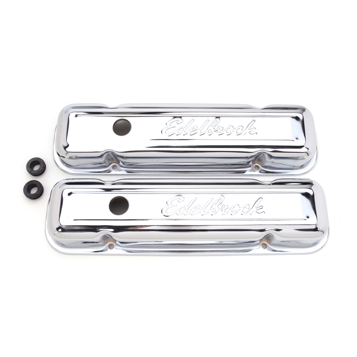 Description_EXT | Edelbrock Signature Series Valve Covers for Pontiac 301-326-350-389-400-421-455. Engineered for function and styled for great looks, Signature Series valve covers have stock-style breather baffles that prevent oil passage to the PCV valve. |