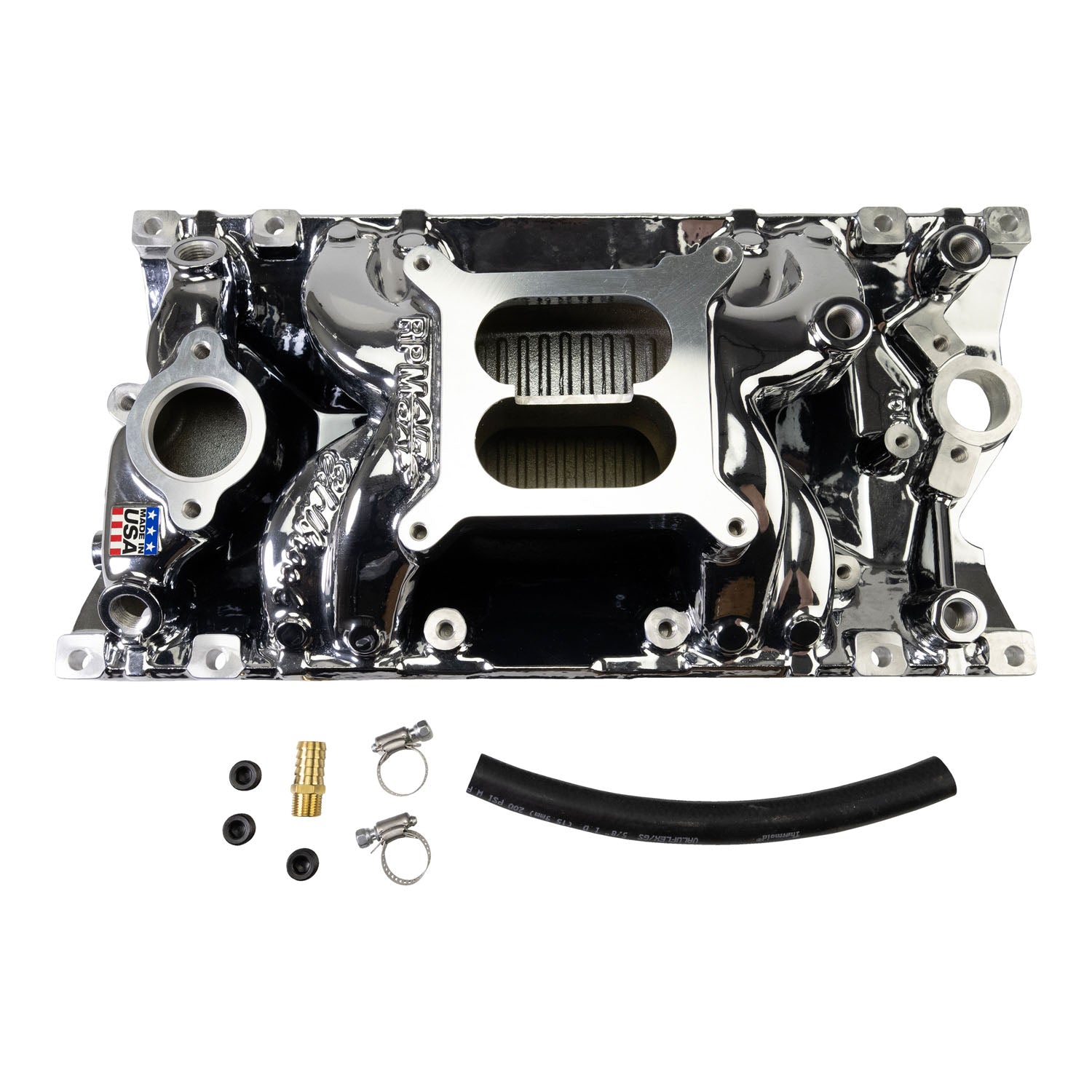 Description_MKT Edelbrock part #7516-CP RPM Air-Gap intake manifold is based on the powerful Performer RPM Vortec #7116. This single four-barrel intake is designed for 262-400 c.i.d. Chevy V8's with 1996 and later Vortec (L31) cast iron or Edelbrock E-Tec aluminum heads. The air-gap design features an open air space that separates the runners from the hot engine oil resulting in a cooler, denser charge for more power. An external water bypass boss is machined into the front of the water crossover for use on 1996 and later Vortec production engines. Includes rear water outlets, nitrous bosses, a temp sensor boss that clears all waternecks, two distributor clamp locations and a heater outlet boss that's angled for proper fit over the valve cover. Accepts 1976 and later alternator and air-conditioning brackets for street installations. For square-bore carbs. The PN 7516-CP version comes with a brilliant Chrome plasma finish that is durable and easy to maintain. No provision for exhaust-heated chokes and no exhaust crossover. Will not fit under stock Corvette hood.
