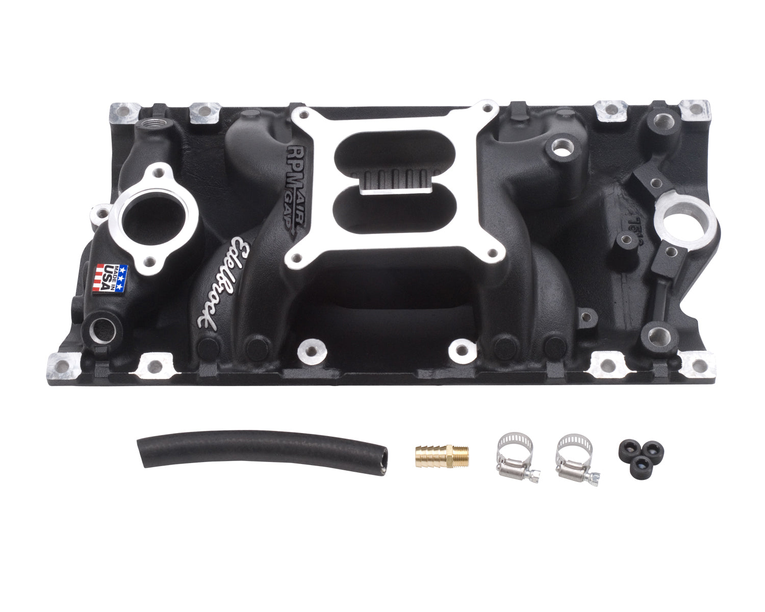 Description_MKT Edelbrock part #75163 RPM Air-Gap intake manifold is designed for 262-400 c.i.d. Chevy V8's with 1996 and later Vortec (L31) cast iron or Edelbrock E-Tec aluminum heads. This intake manifold is based on the powerful Performer RPM Vortec #7116. The air-gap design features an open air space that separates the runners from the hot engine oil resulting in a cooler, denser charge for more power. An external water bypass boss is machined into the front of the water crossover for use on 1996 and later Vortec production engines. Includes rear water outlets, nitrous bosses, a temp sensor boss that clears all waternecks, two distributor clamp locations and a heater outlet boss that's angled for proper fit over the valve cover. Accepts 1976 and later alternator and air-conditioning brackets for street installations. For square-bore carbs. No provision for exhaust-heated chokes and no exhaust crossover. Will not fit under stock Corvette hood. This manifold offers a durable black power coated finish for long lasting protection and a distinctive look.