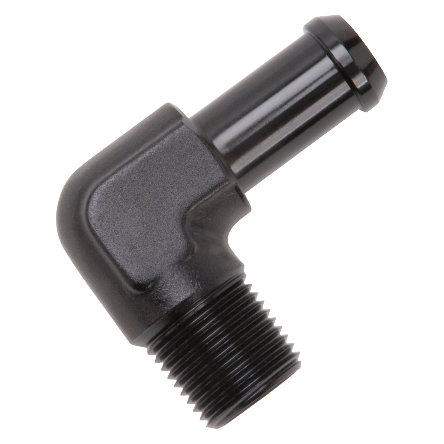 Edelbrock part #8163 heater hose end is designed to hold up to any plumbing task you have. This heater hose end is made from high quality aluminum to ensure they won't rust or corrode. Features 90 deg. End with 3/8" NPT and 1/2" Barb, black anodized finish.