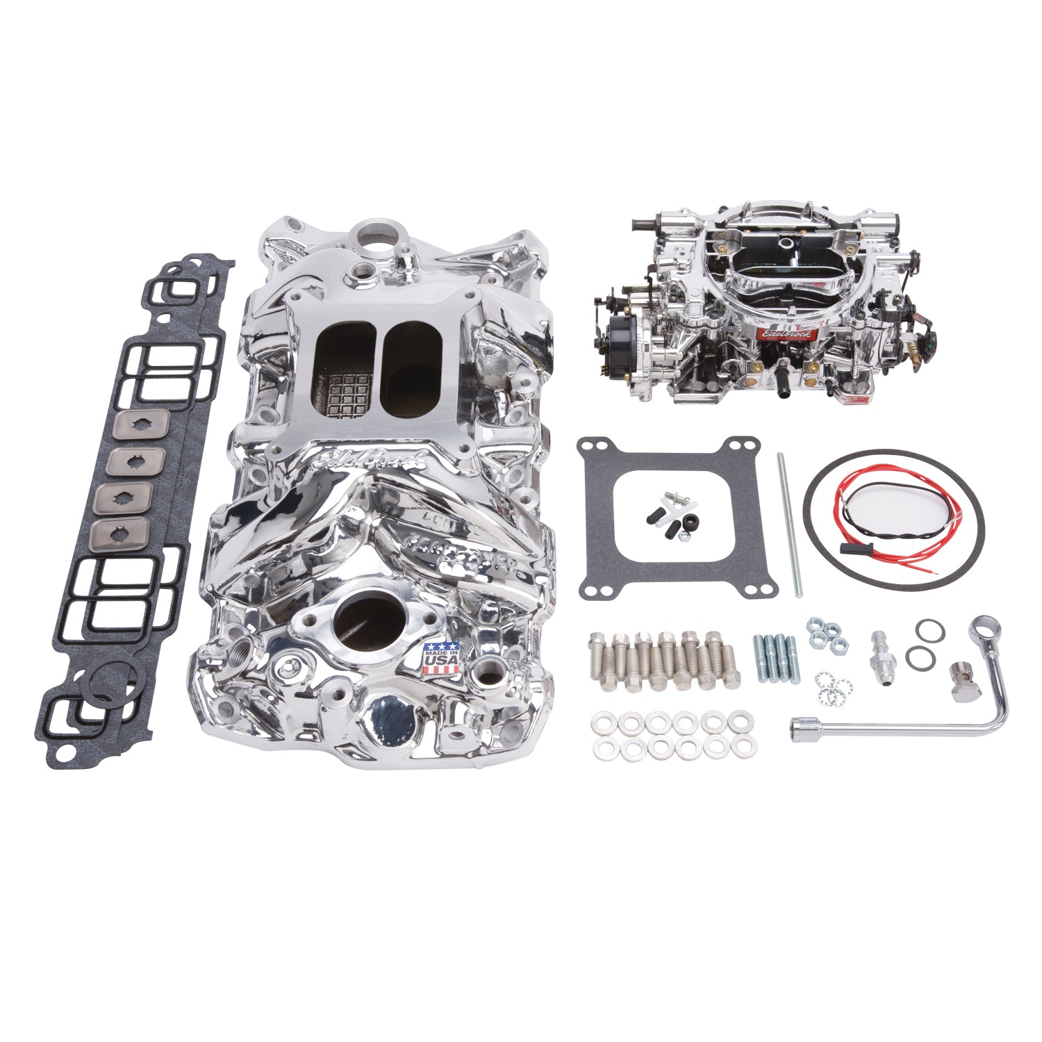 Edelbrock Single-Quad Manifold and carb kit for 1957-86 Small-Block Chevy. With a Manifold and Carb Kit, it's easy to upgrade your induction system with the best combination of Edelbrock proven performance and looks in a single box. |