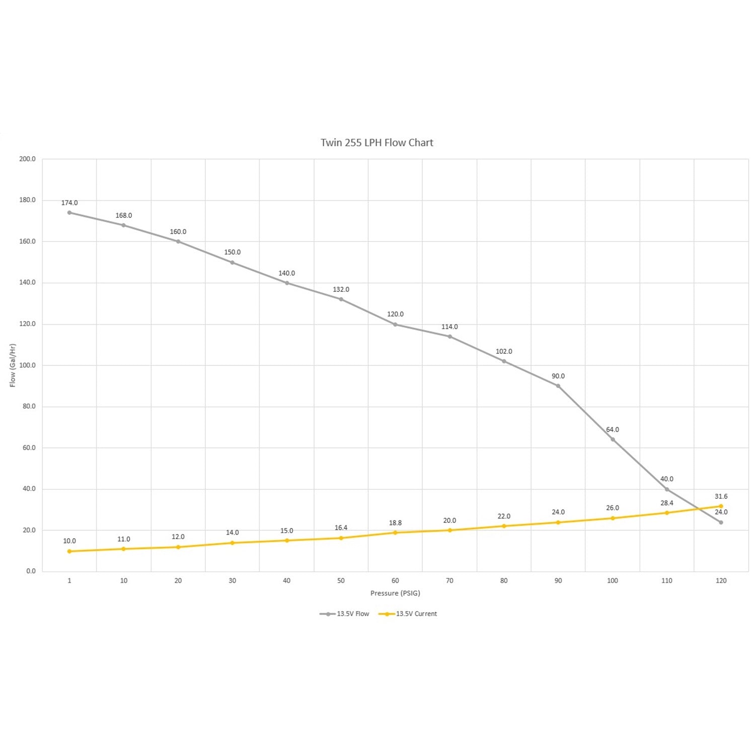 Supports up to 1100 EFI or 1400 Carb HP (@ 60 PSI at 13.5 Volts / 16.9 AMP Draw) |