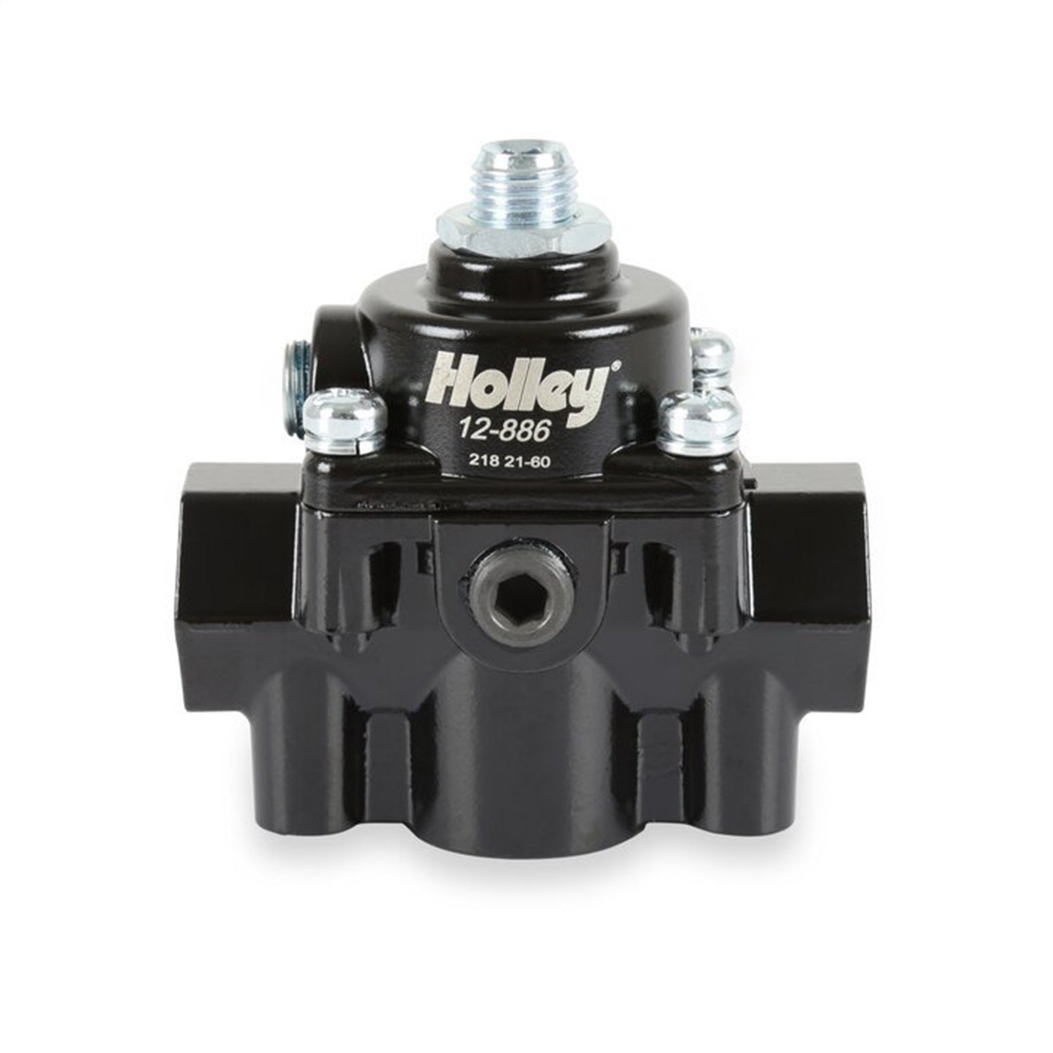 Holley Die Cast EFI Bypass Style Fuel Pressure Regulator Kits are part of a complete line of fuel system products from Holley. The included 12-886 regulator features a die cast aluminum body and a black finish for corrosion resistance and good looks. The regulator contains 3/8 in. NPT in/out ports, a 3/8 in. NPT return port, a 1/8 in. NPT gauge port, and a 1/8 in. NPT vacuum port for Boost Reference (1:1). In addition, 3 Mr. Gasket 3/8 in. NPT to -6 AN fittings, a barbed fitting for the vacuum port, a mounting bracket, and all necessary hardware are also included.