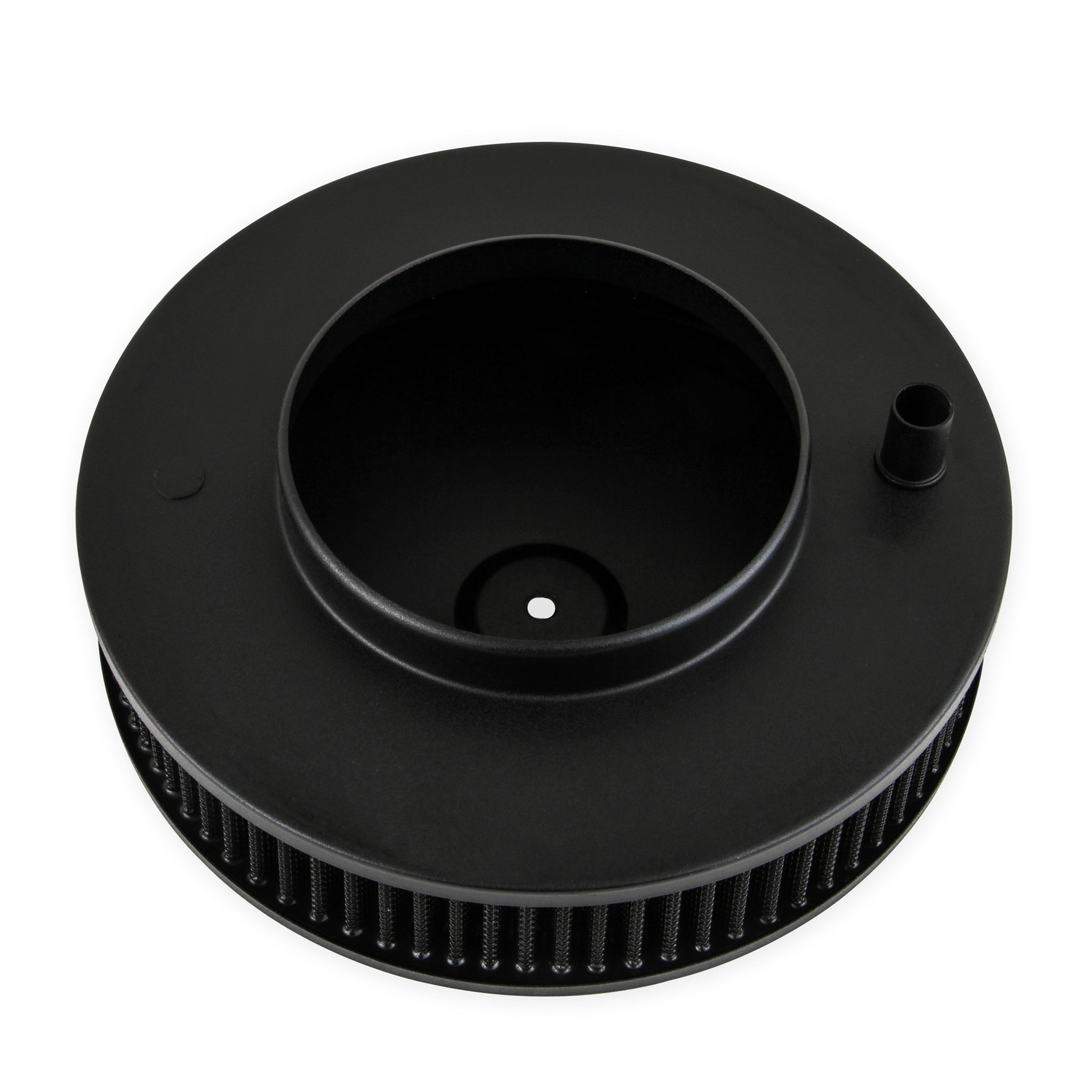 Description_MKT | Holley branded 10 in. Flat Base Black Finish Air Cleaner assembly with black reusable gauze filter element |