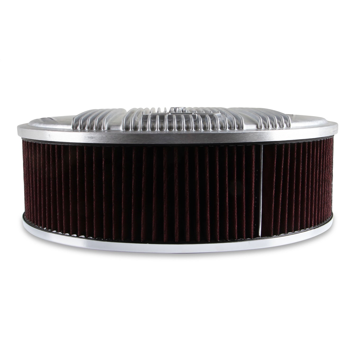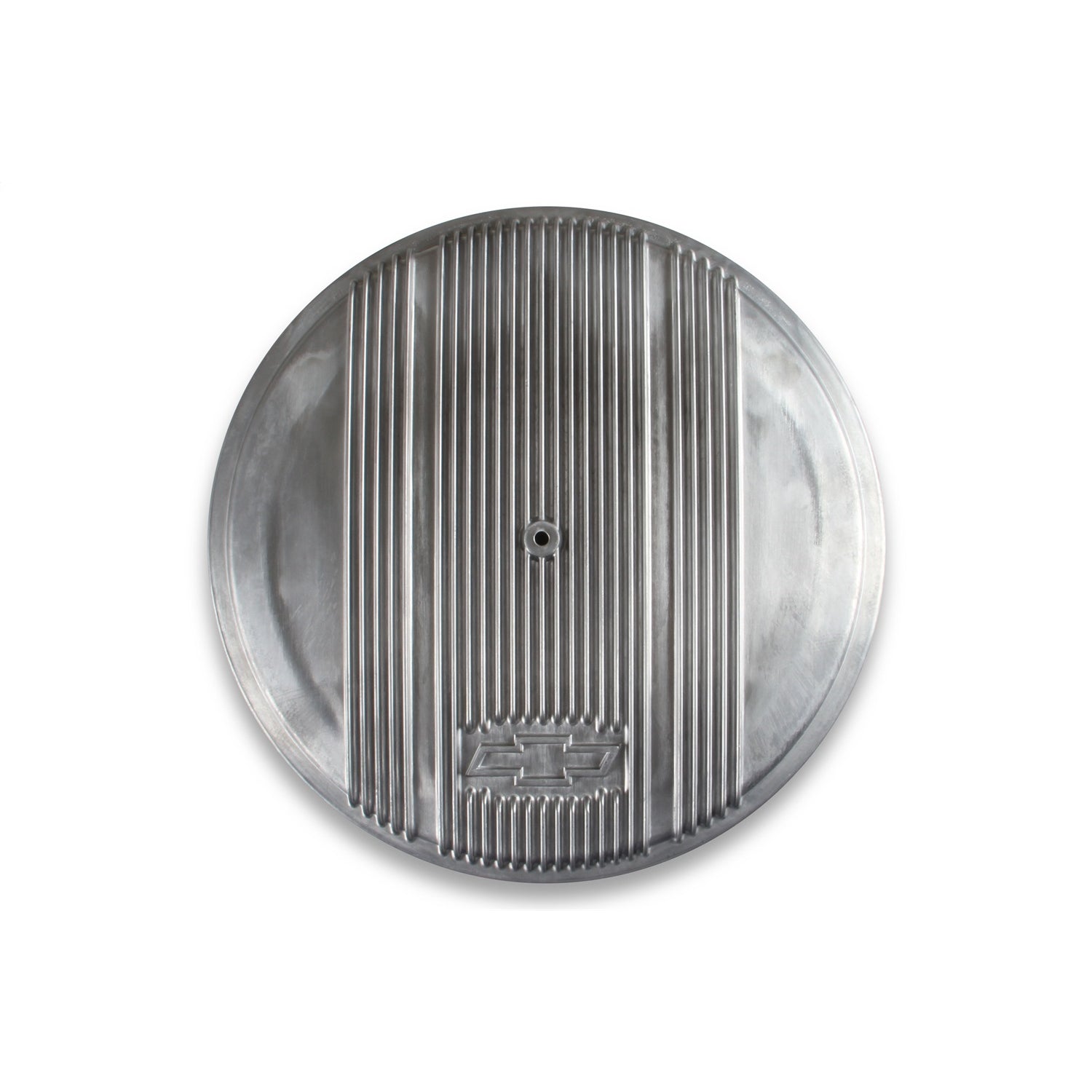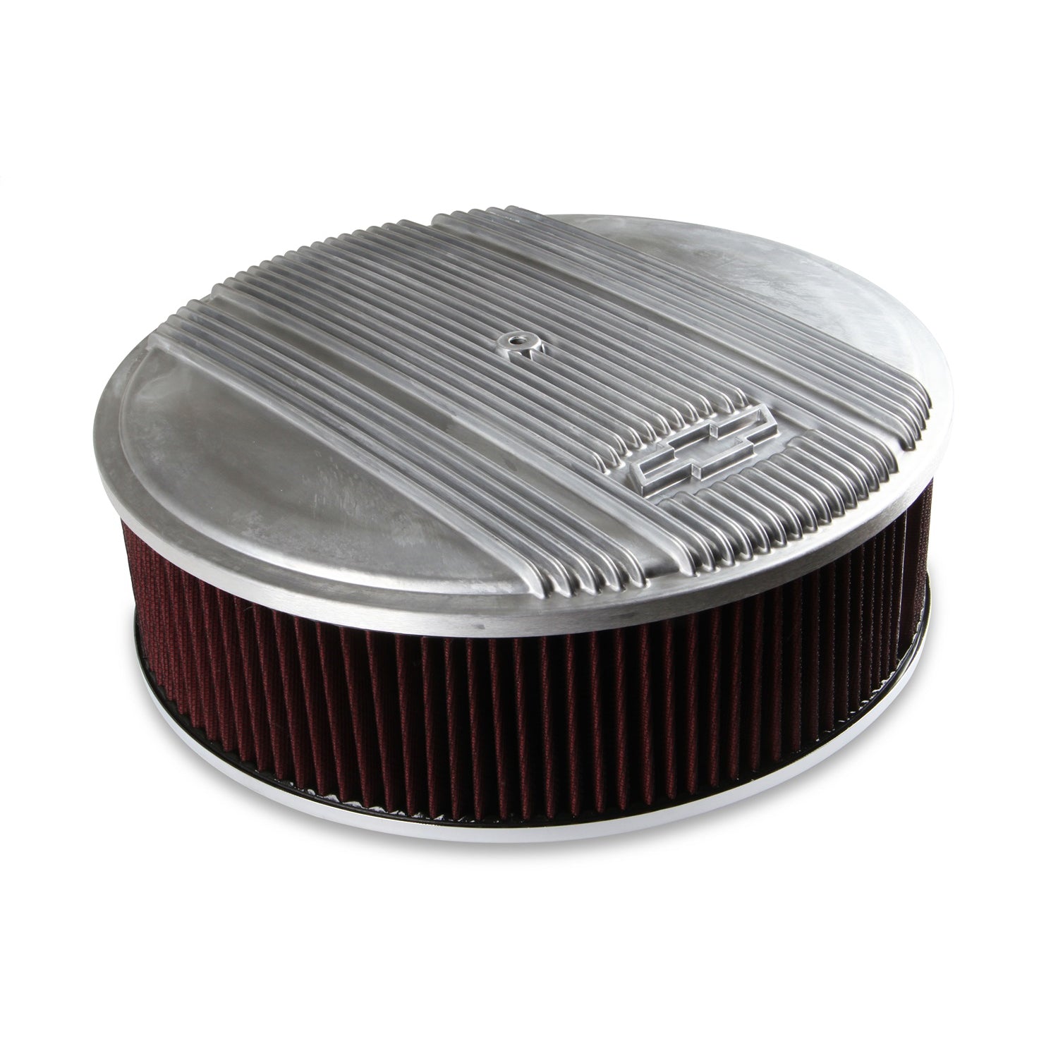 Description_EXT | GM Licensed Vintage Air Cleaner; 14 in x 4 in.; Finned w/Iconic Chevy Bowtie Logo; Knock Out Provisions For Fresh Air Adapter; Premium Filter; Natural Finish; |