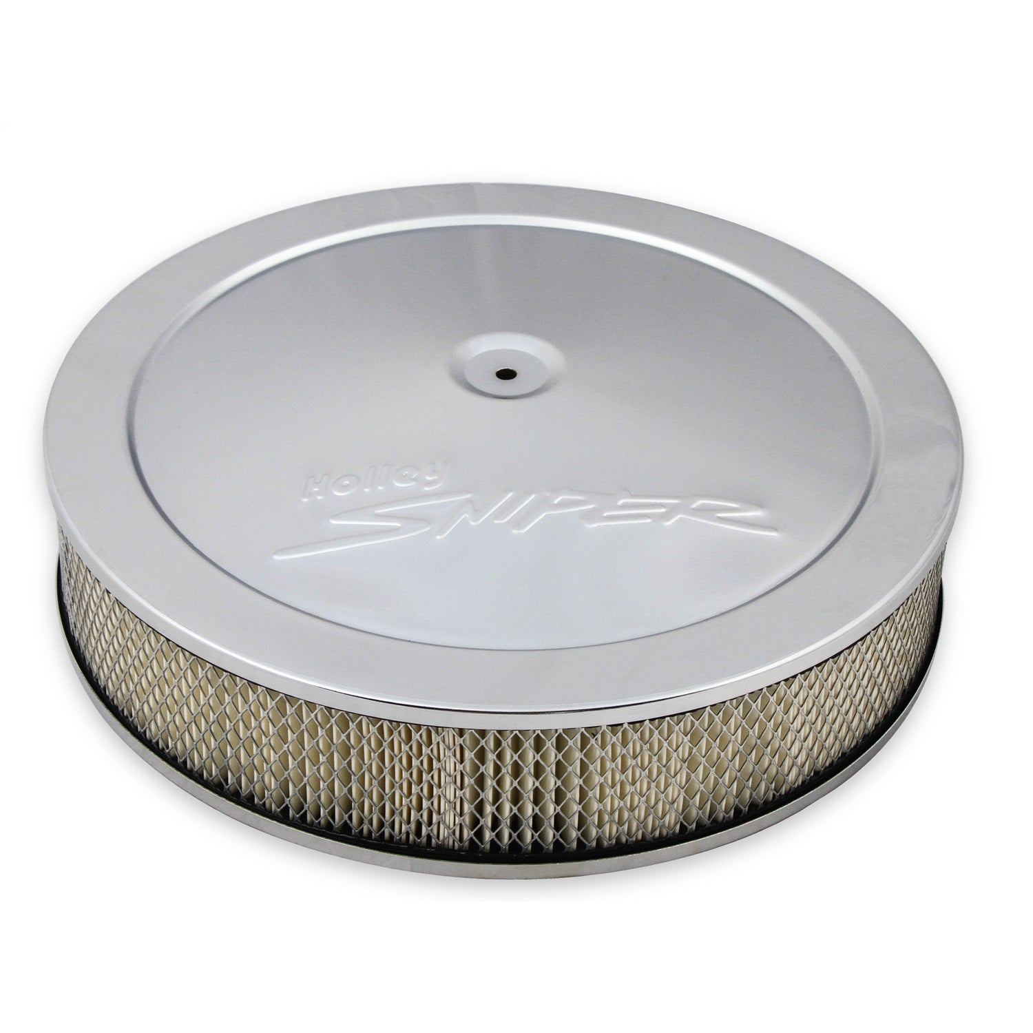 Complete your Sniper upgrade with our new 14 in. Sniper air cleaner assemblies. Each air cleaner assembly includes a stamped steel lid with an embossed Holley Sniper logo, a 1 in. drop base specifically designed for Sniper EFI applications, your choice of a 3 in. or 4 in. paper filter element, and all necessary mounting hardware. The included drop base fits all carbs and throttle bodies with a 5-1/8 in. neck - more specifically Sniper EFI 4150 throttle bodies with clearances for front mounted fuel fittings*, and Sniper EFI 2300 throttle bodies. Available in both black and chrome finishes to best match your SniperEFI unit.