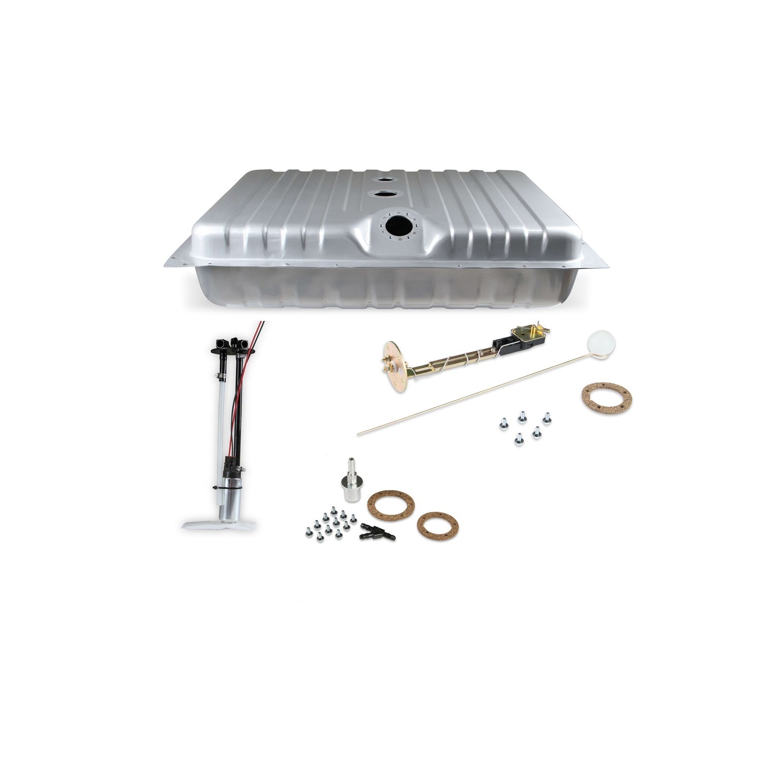 Holley and Sniper will help you to complete your EFI swap with our new EFI Conversion Fuel Tanks. Each tank is a direct fit for your application-no modifications necessary. The kit includes the tank, a 255 lph fuel pump, internal baffling, and a fuel level sender. The tank is powder coated for corrosion resistance and great looks. These tank kits are a complete solution for your EFI project!***Steel filler neck that extends to rear valance is not included. You must use your existing stock filler neck or purchase one through restoration suppliers.***These tanks are perfect for your next classic truck EFI conversion project as well. Supports up to 550 EFI (@ 60 PSI at 13.5 Volts / 10.4 AMP Draw) Size is: 32-5/8 in. x 24-1/2 in. x 9-3/4 in.For a better seal use Permatex IndianHead Gasket Shellac Compound or Aviation Form-A-Gasket sealant on the gasket and screws.