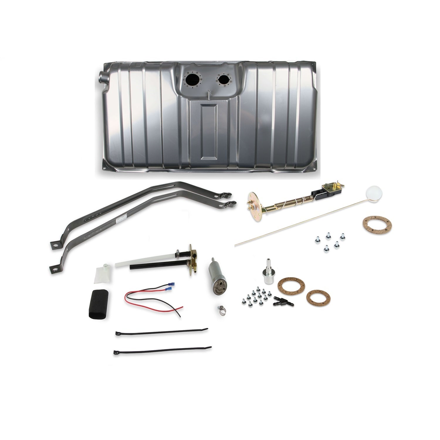 Holley and Sniper will help you to complete your EFI swap with our new EFI Conversion Fuel Tanks. Each tank is a direct fit for your application-no modifications necessary. The kit includes the tank, a 400 lph fuel pump, internal baffling, and a fuel level sender. The tank is powder coated for corrosion resistance and great looks. These tank kits are a complete solution for your EFI project!***Steel filler neck is not included. You must use your existing stock filler neck or purchase one through restoration suppliers. Supports up to 750 EFI (@ 60 PSI at 13.5 Volts / 10.4 AMP Draw) Size is: 34-1/4 in. x 18-7/8 in. x 8-3/4 in.For a better seal use Permatex IndianHead Gasket Shellac Compound or Aviation Form-A-Gasket sealant on the gasket and screws.