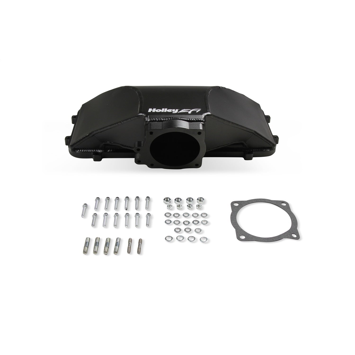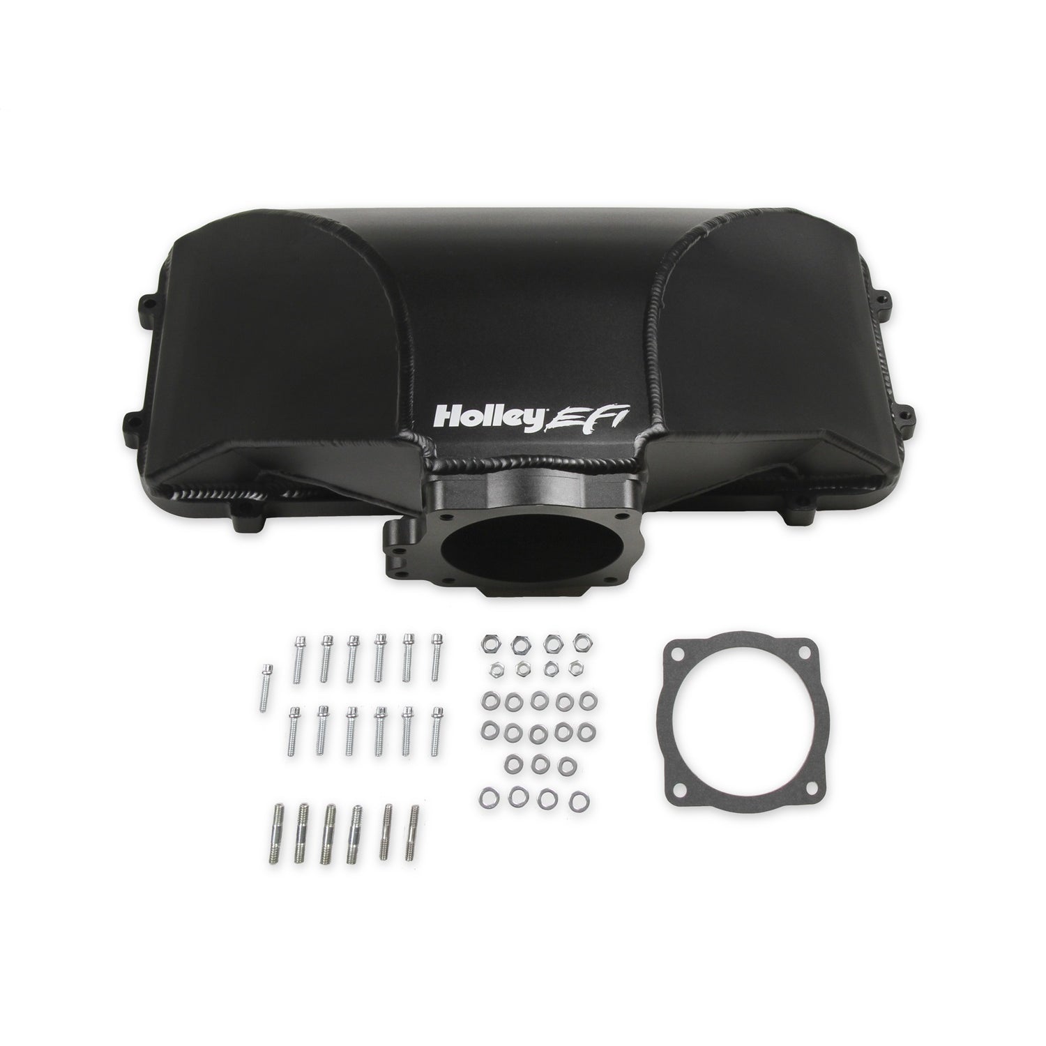 Description_EXT | Holley EFI Hi-Ram Plenum; For Use w/86-95 Ford 5.0 Style Throttle Body; Side Mount; 95 mm. Inlet Size; Fabricated; Aluminum; Black Finish; |
