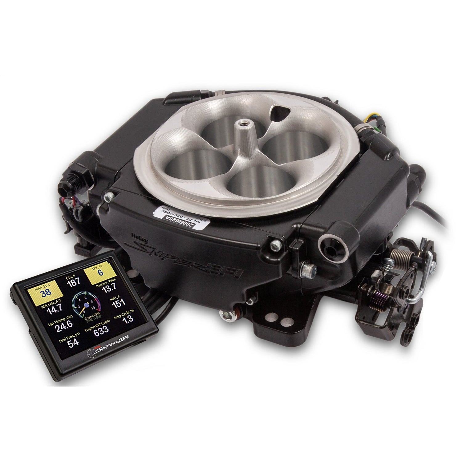 Description_MKT | Introducing Sniper EFI XFlow! Looking to convert your blow through carbureted turbo engine to EFI? Look no further! The Sniper EFI XFlow 1375 from Holley features eight 120 LB/HR Fuel Injectors and flows 900CFM allowing it to safely support up to 1375HP with forced induction! The XFlow comes with an internal 2.5bar MAP sensor that will safely work on boosted applications up to 21.5 psi. For applications making more than 21.5 psi, there are three additional 0-5v Sensor Inputs which can be used for an external MAP Sensor, Dome Pressure for boost control, and/or oil pressure and fuel pressure sensors. An External Fuel Pressure regulator is required; we recommend part number 12-851 for Forced Induction applications. |