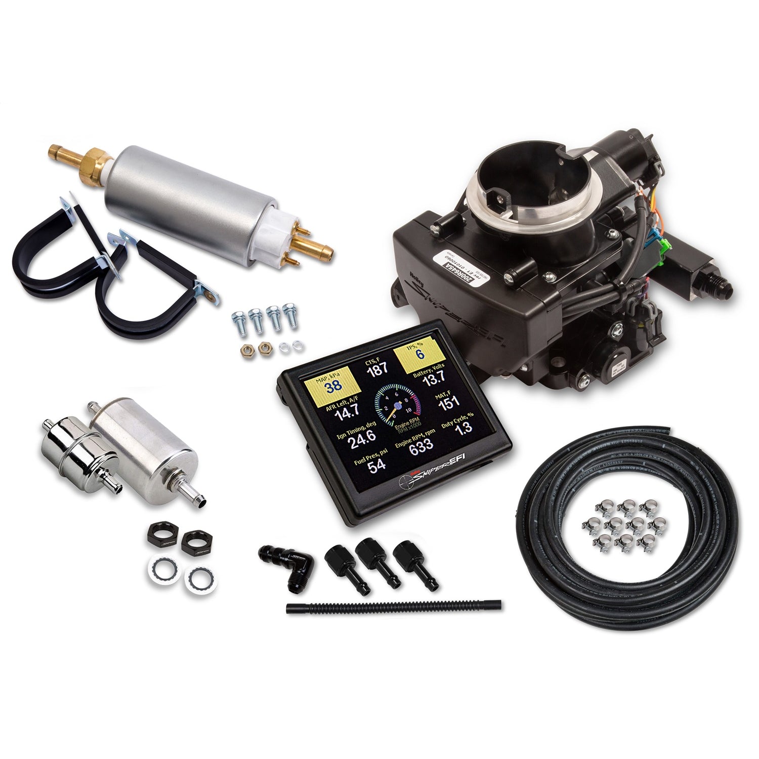Description_EXT | Sniper EFI Self-Tuning Master Kit; 2GC Small Bore Carburetor To EFI Conversion; Incl. Touch Screen/Wideband Oxygen Sensor/20 ft. Hose/Filters/Fuel Pump/Hardware; Black; |