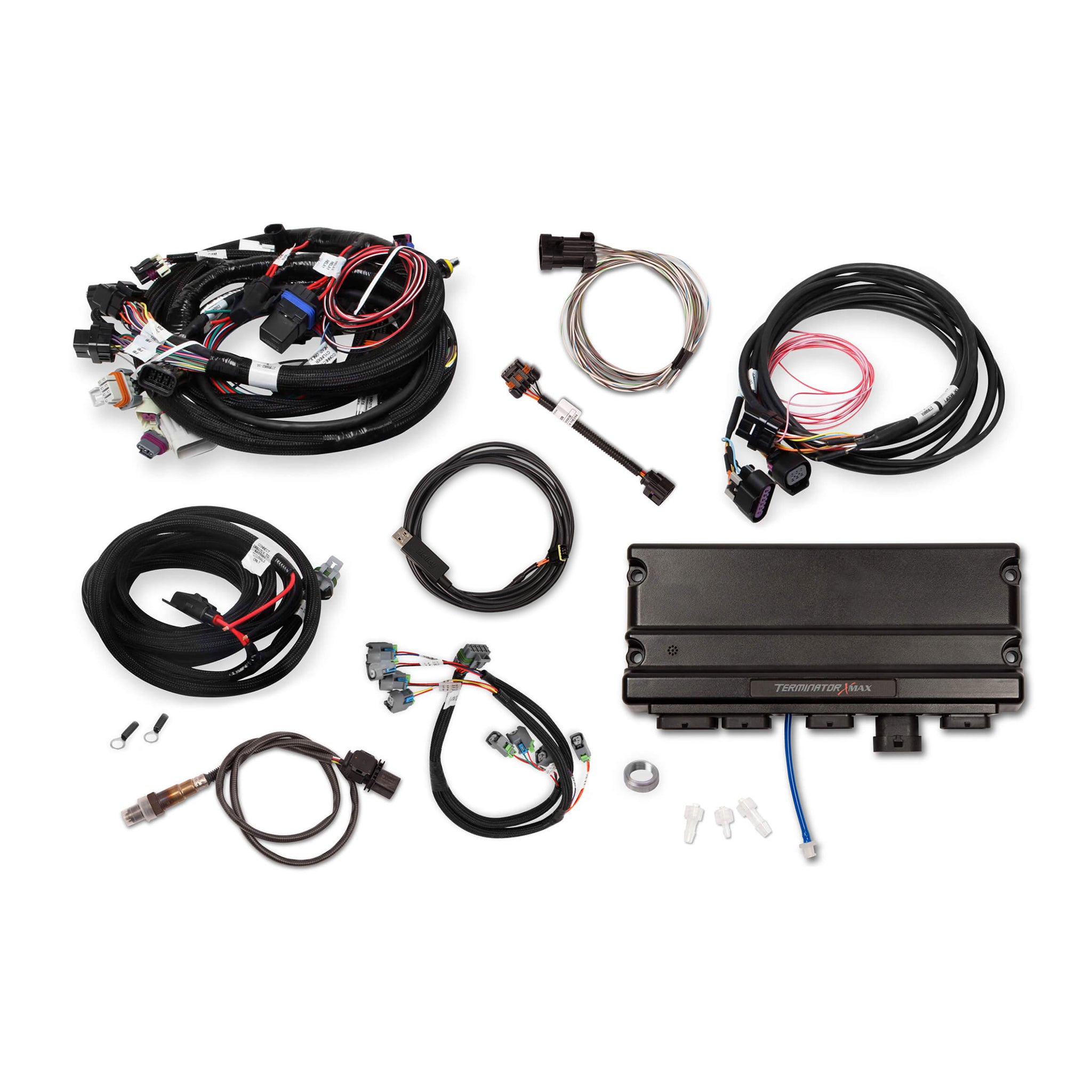 Description_FAB | Includes: 24x LS Engine Main Harness - EV6 Injector Harness - DBW Throttle Body Harness - Terminator X MAX ECU - ECU Main Power Harness - Bosch LSU 4.9 Wideband Oxygen Sensor - Input/Output Harness - and assorted vacuum adapters. |
