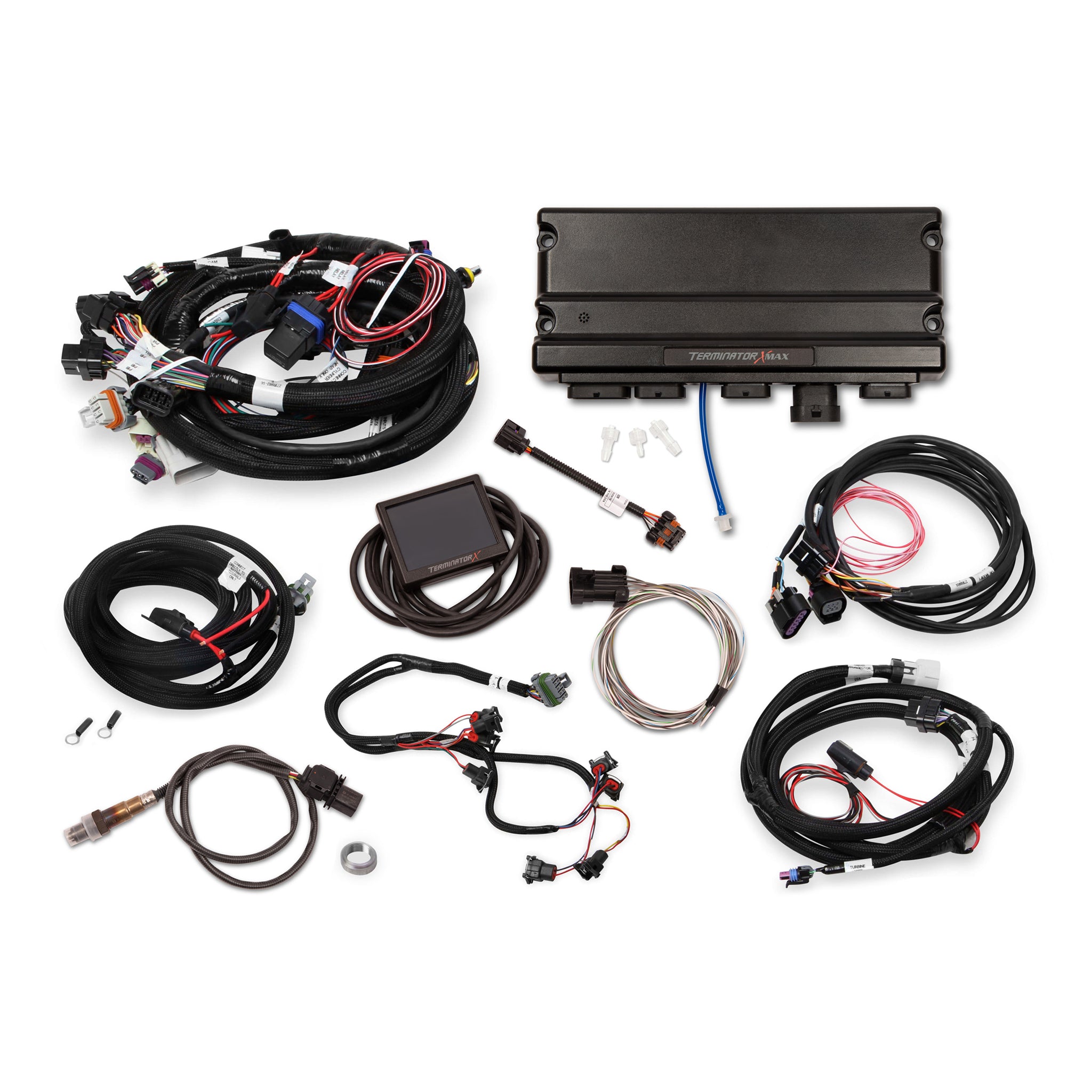 Description_FAB | Includes: 24x LS Engine Main Harness - EV6 Injector Harness - DBW Throttle Body Harness - 4L60E/4L80E Transmission Control Harness - Terminator X MAX ECU - ECU Main Power Harness - Bosch LSU 4.9 Wideband Oxygen Sensor - Input/Output Harness - and assorted |