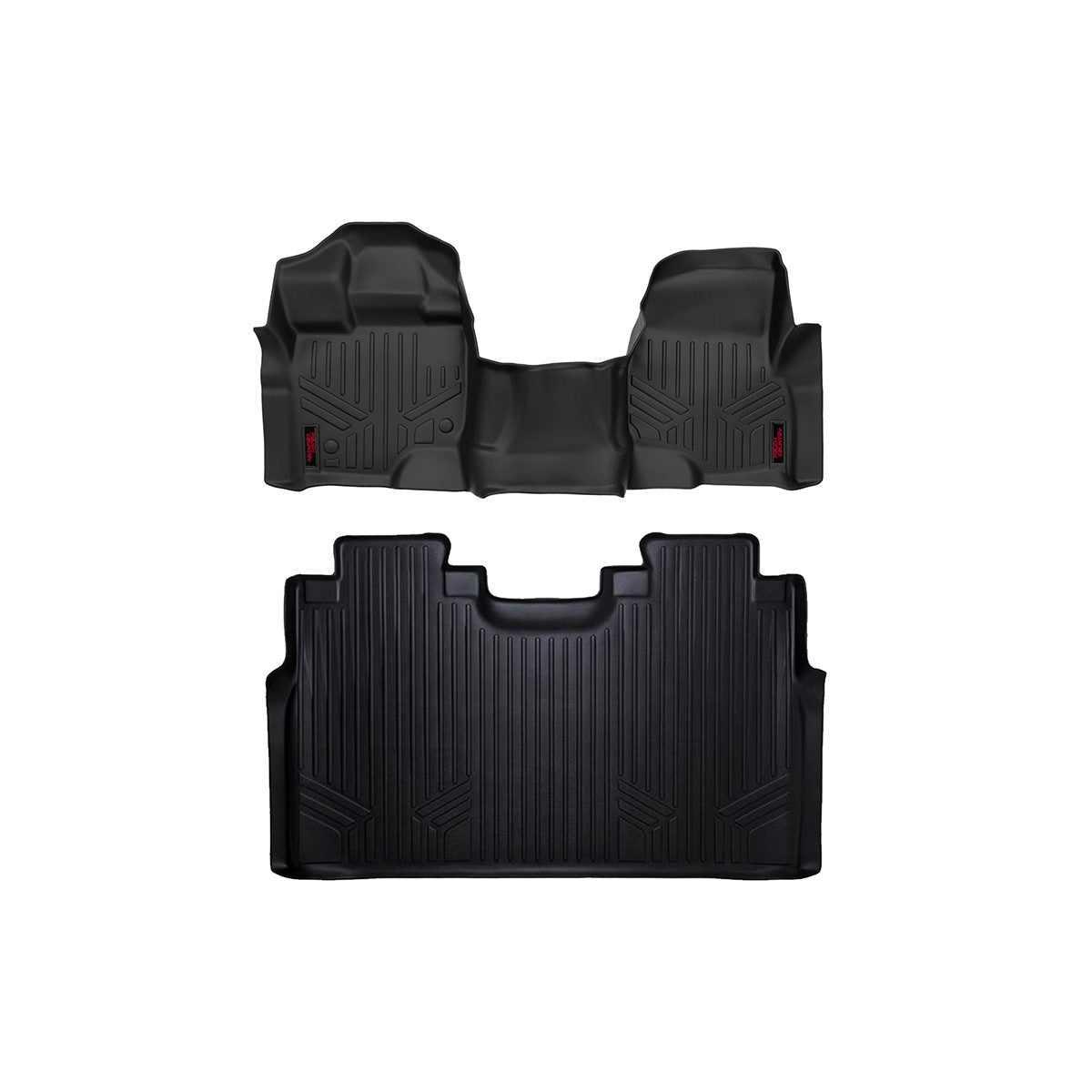Keep your carpet in pristine condition with Rough Country's Floor Armor: Heavy Duty Floor Mats and Rear Cargo Liners. These eco-friendly, semi-flexible floor mats are made of an ultra-durable Polyethylene that offers a strong, rigid shape that's incredibly easy to clean.Where simple rubber floor mats fail, Rough Country's line of Floor Armor is guaranteed for life and will never crack, split, or break-down over time. The high-quality design extends the lifespan of your carpets and the raised-lip design insures your interior will always be protected from mud, moisture, and more.These contoured floor mats are laser-measured for each make and model; designed to be a precise fit that grips the carpet and stays put. An aggressive looking textured surface gives your muddy shoes plenty of traction and looks great inside the vehicle.No matter what you track in, Rough Country Floor Armor is incredibly easy to clean. Just pop them out of the floorboards and rinse away the dirt! Includes Rough Country's Lifetime Replacement Warranty.Features:Quick and easy installationMeticulously engineered to fit each vehicle exactly rightAll weather protection against Snow, Mud, Sand, Salt Water and More!Resist extreme temperaturesProtect against soda, coffee spills or accidentsSpill Saver Lip (Prevents spills from reaching the carpet)Textured surface keeps feet from slippingEco-friendly, low density polyethylene provides full flexibility to ensure a lasting shapeEasy to Clean and Maintain (Detachable from Vehicle)Limited Lifetime WarrantyNotes:Fits SuperCrew Cab Trucks OnlyFits models with front bench seat OnlyDetails:Sold As EachColor BlackFinish TexturedMaterial PolyethyleneLocation Front|RearDrive 2WD|4WDCab Size Crew Cab |