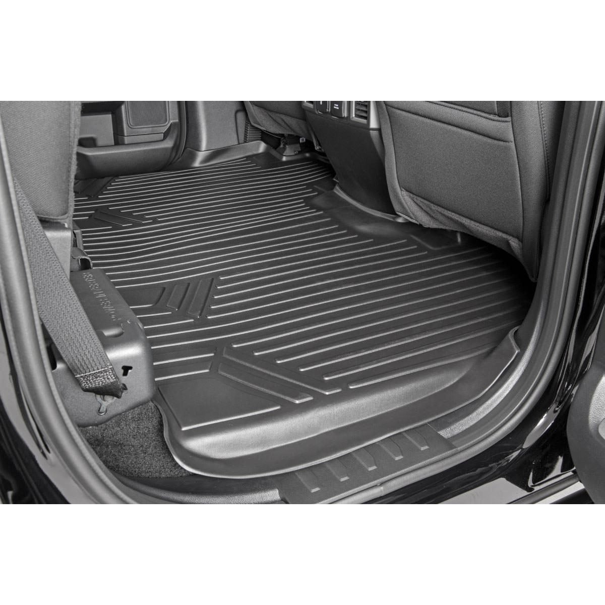 Keep your carpet in pristine condition with Rough Country's Floor Armor: Heavy Duty Floor Mats and Rear Cargo Liners. These eco-friendly, semi-flexible floor mats are made of an ultra-durable Polyethylene that offers a strong, rigid shape that's incredibly easy to clean.Where simple rubber floor mats fail, Rough Country's line of Floor Armor is guaranteed for life and will never crack, split, or break-down over time. The high-quality design extends the lifespan of your carpets and the raised-lip design insures your interior will always be protected from mud, moisture, and more.These contoured floor mats are laser-measured for each make and model; designed to be a precise fit that grips the carpet and stays put. An aggressive looking textured surface gives your muddy shoes plenty of traction and looks great inside the vehicle.No matter what you track in, Rough Country Floor Armor is incredibly easy to clean. Just pop them out of the floorboards and rinse away the dirt! Includes Rough Country's Lifetime Replacement Warranty.Features:Quick and easy installationMeticulously engineered to fit each vehicle exactly rightAll weather protection against Snow, Mud, Sand, Salt Water and More!Resist extreme temperaturesProtect against soda, coffee spills or accidentsSpill Saver Lip (Prevents spills from reaching the carpet)Textured surface keeps feet from slippingEco-friendly, low density polyethylene provides full flexibility to ensure a lasting shapeEasy to Clean and Maintain (Detachable from Vehicle)Limited Lifetime WarrantyNotes:Fits SuperCrew Cab Trucks OnlyFits models with front bench seat OnlyDetails:Sold As EachColor BlackFinish TexturedMaterial PolyethyleneLocation Front|RearDrive 2WD|4WDCab Size Crew Cab