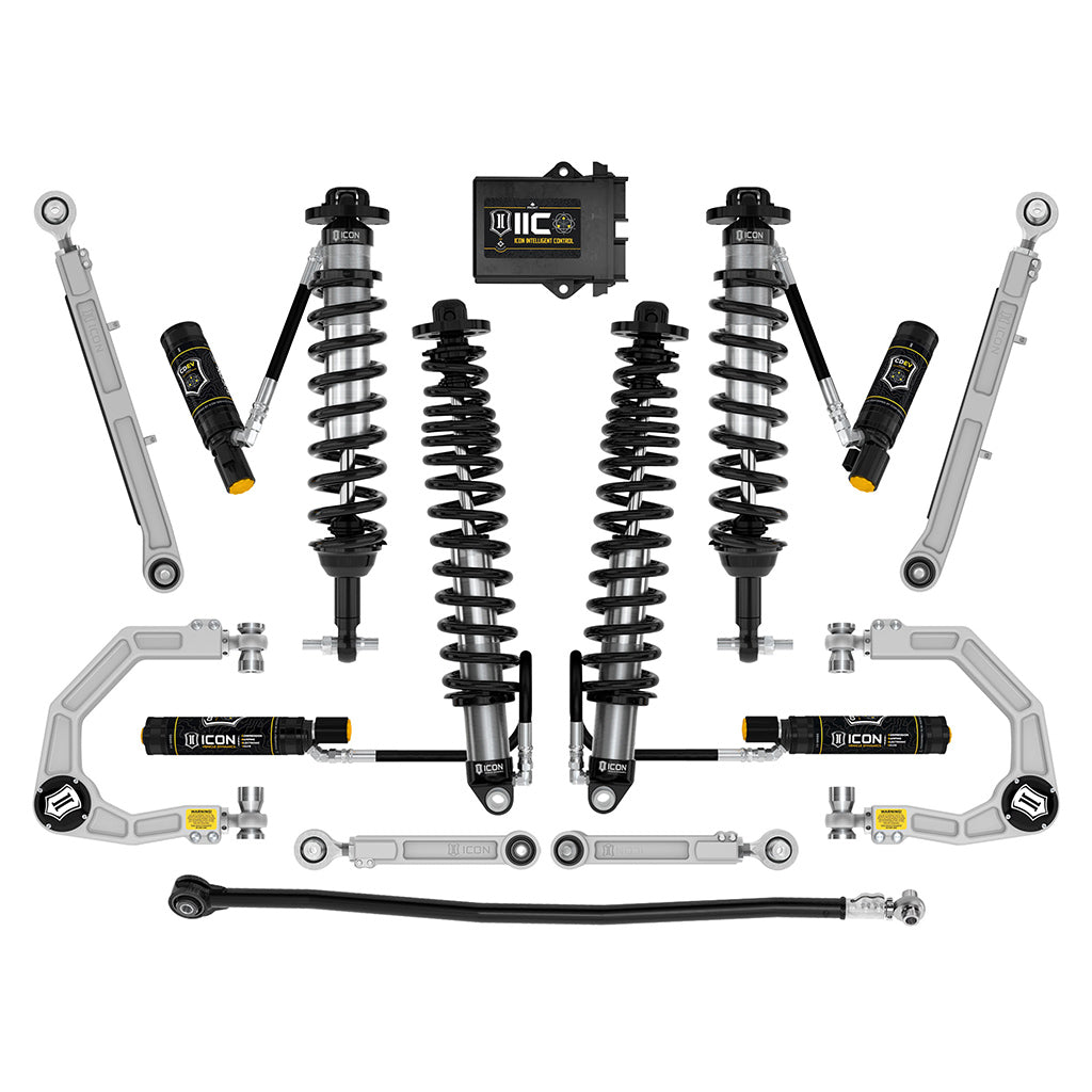 Description_MKT The ICON Vehicle Dynamics Stage 8 Suspension System for the 2021-2023 Ford Bronco features our precision-manufactured, custom valved remote reservoir coilover shocks with CDEV to yield the maximum travel possible along with superior ride quality and suspension performance both on and off-road. These coilovers also allow for the adjustment of ride height to yield 2-3" of front lift and 1.25-2.25" of rear lift over stock 4-door Broncos with the Sasquatch Package. Remote reservoirs greatly increase shock oil volume and heat dissipation surface area to resist overheating and cavitation under hard use, which can lead to damper fade, ensuring sustained shock performance at speed through rough terrain. ICON's Top of The Range suspension system features lightning fast, precise electronic shock tuning, on-the-fly, at any speed and in any terrain. Focus on driving and let ICON Intelligent Control (IIC) read the terrain and make near-instant adjustments via the Compression Damping Electronic Valve (CDEV) at each individual shock. Control the system wirelessly through the IIC app on your phone and once configured the system functions without driver input. This Stage 8 kit comes with Billet Aluminum Upper Control Arms which provide on-vehicle caster and camber adjustability and feature our patented Delta Joint PRO, which allows for up to 90-degrees freedom of movement. The billet rear links have been designed to free up suspension bind, offer on-vehicle pinion angle adjustment, and optimize clearance from the fuel tank during maximum articulation and feature greaseless bushings and massive FK rod ends. The Adjustable Track Bar also features our dual-durometer greaseless bushing and an FK Rod End, as well as on-vehicle adjustability for perfectly aligning the Bronco's rear axle for any lift height. The rear CDEV coilover shocks are oriented shaft-up with unique triple-rate coil springs to achieve the most rear suspension travel and the best ride quality possible.