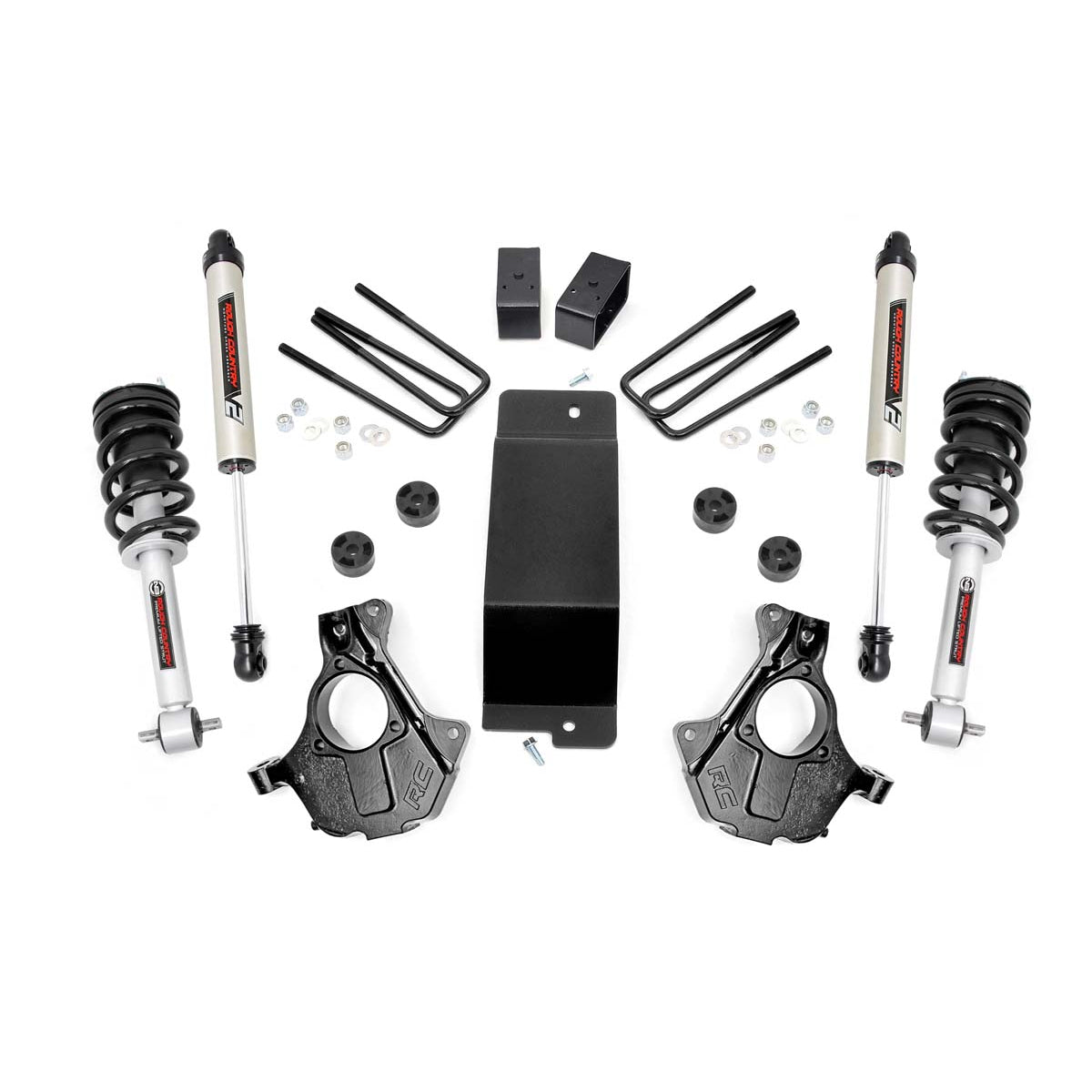 If you're looking for not-to-tall and not-too-small, Rough Country's 3.5 Lifted Knuckle kit is the perfect option for increased ground clearance and aggressive good looks! This all-inclusive kit features everything you need for a stunning, new appearance and enhanced off-road action, with a host of features designed to promote an incredible suspension geometry and ride quality! Rough Country's 3.5-inch kit features a set of lifted knuckles allowing you to lift your vehicle in the best possible way.Other kits Onlyreplace your upper control arms which can leave your CV boot prone to damage by making contact with the lower arms. Rough Country's innovative, lifted knuckle design gives you plenty of clearance to keep your CV out of harm's way while promoting a better upper arm ball joint angle and better ride quality to boot. This kit includes Rough Country's premium V2 Monotube shocks!These 10-stage variable valving, high-pressure Nitrogen charged shocks offer a fantastic blend of off-road action and smooth highway ride quality. Also included in this kit are a set of fabricated rear blocks that are stronger and offer a longer lifespan than cast blocks while being less susceptible to damage and the environment. This kit also includes Rough Country's Performance N3 Struts for improved tire contact with the road and increased stability and performance.These struts are engineered to fit perfectly on each intended application, and feature a pre-installed coil spring for easy installation without the need for strut disassembly. Simply remove your factory strut and replace with this easy, convenient system. The result is an increased ride height that mimics the factory responsiveness and handling of the OE strut. Includes a Lifetime Replacement Guarantee! Features: Increased ground clearance.Includes pre-loaded coil for no-fuss assemblyIncreased CV axle boot clearance with the stamped steel lower control arm.Retains factory suspension componentsLevels front with rearFabricated lift blocks are stronger and offer a longer lifespan than cast blocks.Features application valved V2 Monotube series shock absorbers which offer the best in balanced performance for on and off-road use.Notes: Requires cutting and grinding If using factory wheels, a 0.25in wheel spacer is Required. #1065 Does Not work with aftermarket control arms Does Not fit models with stock Cast Steel control arms. Does Not fit GMC Denali models with Magnetic Ride Control. New lift block replaces the factory equipped block. If truck is equipped with a mass damper on the front differential, the damper must be removed.Details:Sold As KitDrive 4WDTire Info 285/70 R17:Factory 17:-- 285/70 R17:17x9:-:0 to +18mm 285/65 R18:Factory 18:-- 285/65 R18:18x9:-:0 to +18mm 285/55 R20:Factory 20:-- 285/55 R20:20x9:-:0 to +18mmLift Height 3.5 inchFront Components N3 lifted struts Lifted knuckles Differential drop spacers Differential skid plate HardwareRear Components 3.0 inch fabricated lift blocks U-bolts Hardware