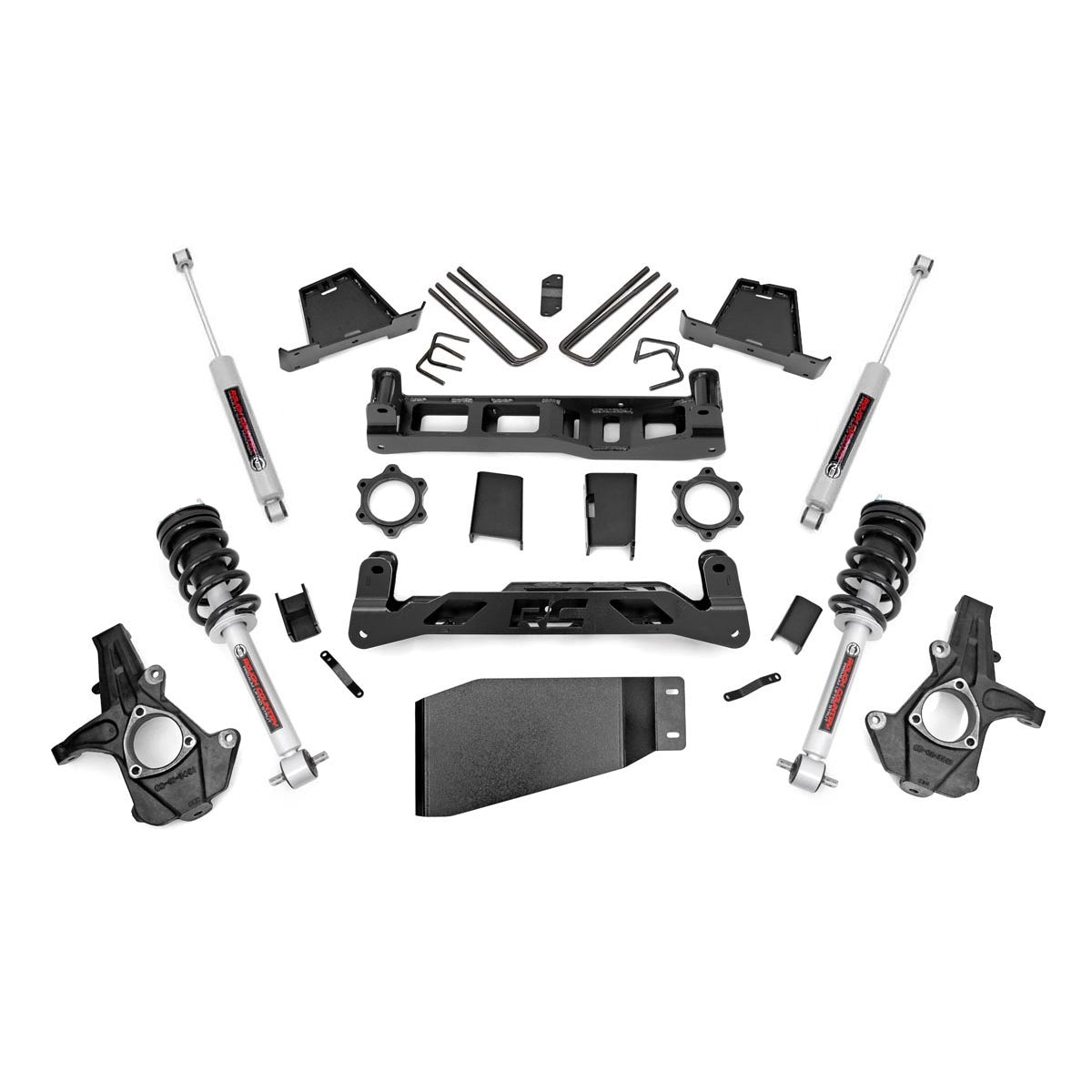 Gain ride height at an incredible value with Rough Country's 7. 5-inch Suspension Lift for '07 - '13 Chevy, GMC 1500 Pickup. This massive lift affords your truck the ability to run up to an impressive 35-inch tire on factory wheels with our unmatched front and rear high-clearance crossmembers featuring the RC logo.Heavy duty upper strut spacers, a beefy lower skid plate, and a set of differential and sway-bar drop brackets are also included; designed by our in-house Research and Development team with 100 percent laser-cut materials for the best possible fit on your vehicle.This whopping 7. 5-inch Lift also comes with a set of rear 6. 5-inch fabricated anti-wrap lift blocks that offer a huge boost while helping combat dreaded axle wrap issues on inferior big lifts.Give your pickup a level stance easily, with no modification to the stock differential mounts, drivetrain or exhaust Required to install!Features: Can run 35 inch tires on factory 20 Inch wheels.Provides highly sought level stance.High clearance crossmember design gives unmatched ground clearance.Requires no modification to the stock differential mounts, drivetrain or exhaust.100 percent precision laser cut materials using the latest computer aided design process.No need to disassemble your struts to installSpecially designed anti-axle wrap rear blocks maintain stock ride quality while eliminating common lift block problem.Fabricated blocks are stronger and offer a longer lifespan than cast blocks.Includes application valved N3 series shock absorbers which offer the best in balanced performance for on and off-road use.Notes: Requires minor cutting and drilling. Does Not fit 2007 Classic models. Does Not fit models with electric steering. AWD models will Require driveline modifications. (Must be converted to non-AWD). 18 inch or larger wheels are Required. Please view installation instructions for complete information on proper tire/wheel combinations.Details:Sold As KitDrive 4WDTire Info 315/70 R17:17x9:-:+12 to +18mm 1,2295/70 R18:Factory 18:-- 2315/65 R18:18x9:-:+12 to +18mm 1,2295/60 R20:Factory 20:-- 2315/55 R20:20x9:-:+12 to +18mm 1 Factory 18.0 inch and 20in wheels can be run but require 1/4.0 inch wheel spacers with 295 tires 2 Models equipped with Factory 18-inch or larger wheels must run 18-inch or larger wheels if changing to aftermarket wheelsMax Tire 35.0 inchLift Height 7.5 inchFront Components Lifted knuckles Front crossmember Rear crossmember Lifted N3 Struts Brake line brackets CV spacers Differential drop brackets Differential skid plate Sway-bar drop brackets HardwareRear Components 7.0 inch fabricated lift blocks U-bolts Hardware
