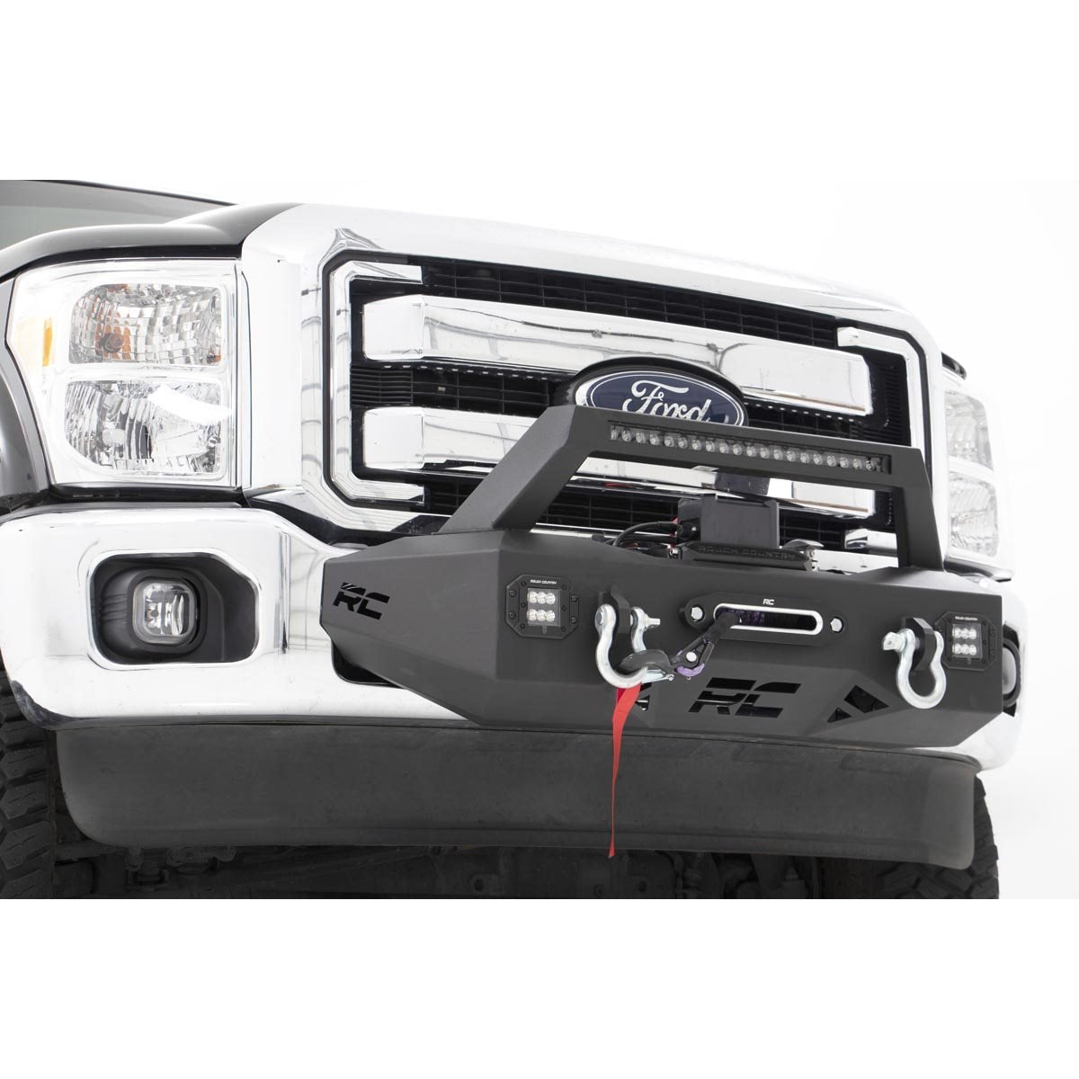 Add a professional recovery and lighting solution to your vehicle with Rough Country's EXO Winch Mount System for Ford F-series Trucks. This innovative recovery solution bolts-on right over the factory bumper, giving your truck a wealth of new abilities and aggressive good looks.Rough Country's EXO Winch Mount System features a 20in Black Series Single-Row LED Light bar and two Flush Mount Black-Series LED Cubes for incredible off-road illumination. A rugged 1/4in thick steel winch mount can fit any standard-sized winch while a set of reinforced d-rings offer the perfect recovery point to get you out of any jam.Best of all, this kit is easy to install, with a 100 percent bolt-on installation process that's simple enough to do in any home garage and can be fully returned to stock at any time.Upgrade your truck with Rough Country's EXO Winch Mount System and gain incredible recovery and lighting power in an instant!Features: Sleek, aggressive appearance100 percent bolt-on installationCan be easily returned to stockIncludes winch guardIncludes (2) Rough Country 2in Black Series LED CubesIncludes (1) Rough Country 20in Black Series Single-Row LED Light BarIncludes (2) heavy-duty D-ringsFits Rough Country Winches and other standard-sized brandsNotes: Winch sold separately Shop Rough Country Winches May interfere with sensors on front bumper May Not work with over sized or non-standard sized winches LEDs are for off-road use OnlyDetails:Sold As KitSeries EXO SeriesMaterial SteelDrive 2WD|4WDMount Style Bolt OnThickness 0.25 inchBar Type Single RowBar Length 20.0 inch