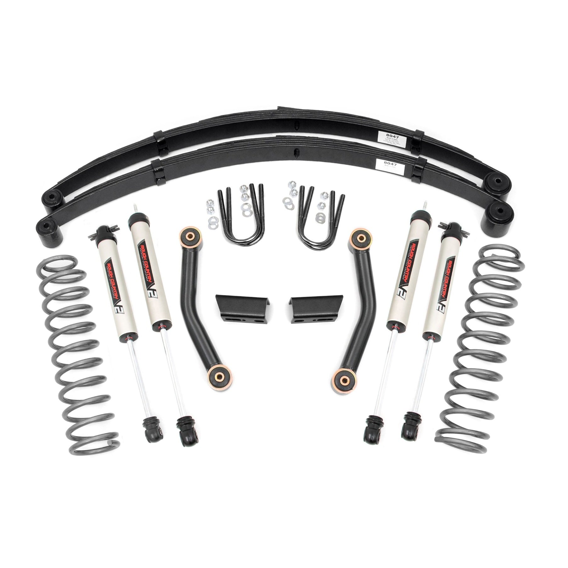 This all inclusive lift kit features everything you need to hit the ground running, with an exciting upgrade to our previous design. This kit now features our new V2 shocks with incredible ride quality and performance.With this redesigned lift, you'll be paired up with the most versatile shocks on the market - balanced for performance on and off-road and custom tuned for this application. This lift also ships with a set of lifted coil springs, which help level the vehicle while providing enough clearance to run up to 31 Inch tires. Features:Easy bolt-on installationIncreased ground clearanceLevels the front with the rear of the vehicle - Gain 3 inches in the front and 1.5-2 inches in the rearControl arms include Clevite brand OEM style rubber bushingsIncludes application valved N3 series shock absorbers which offer the best in balanced performance for on and off-road use.Details:Fitment 1984-2001 2WD Jeep Cherokee XJ/1984-2001 4WD Jeep Cherokee XJDrive 2WD/4WDSold As KitCountry of Origin USASize 3.0 InchShock Series V2 SeriesMount Bolt OnMax Tire Size 31.0 InchInstall Time 3-4 HoursFront Components 3 Inch lifted coil springs Fixed lower control arms Sway-bar brackets HardwareRear Components Lifted Leaf Springs Hardware