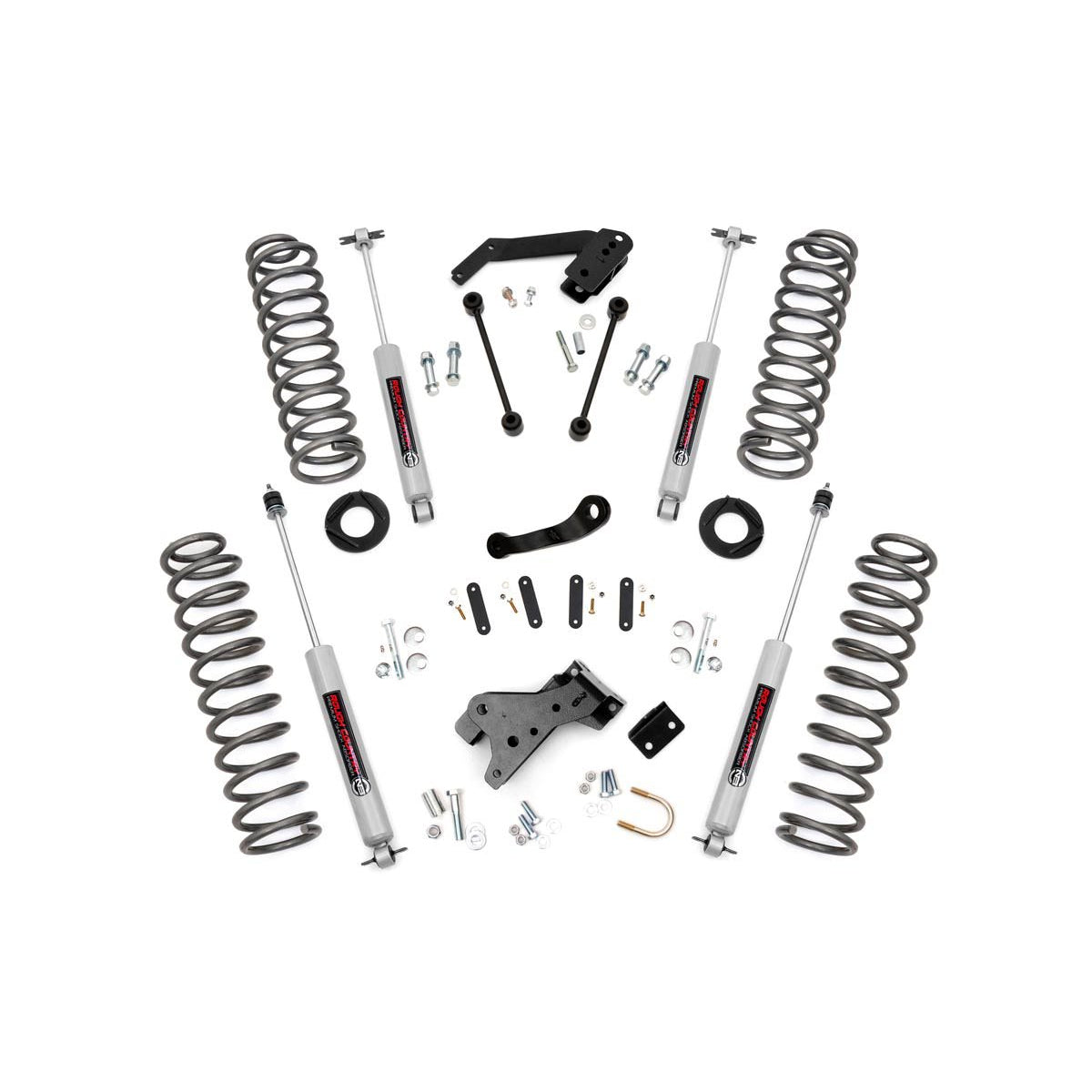 Give your Jeep a total transformation with Rough Country's 4in Suspension Lift! This all-inclusive kit comes with everything you need to give your vehicle aggressive good looks and improved off-road performance!This kit features lifted coil springs and coil correction plates, providing lift height and impeccable vibration dampening on any terrain. Best of all, this kit features Rough Country's premium N3 shocks!These 10-stage variable valving, high-pressure Nitrogen charged shocks offer a fantastic blend of off-road action and smooth highway ride quality.With a durable 18mm spring-loaded piston rod and faster-cooling 54mm shock body, this shock offers up to 36kN Tensile Strength for a long lifespan of impressive vibration dampening. Features natural rubber bushings and an eye-catching metallic silver paint.Features: Easy bolt-on installationIncreased ground clearanceCoil correction plates correct the rear coil spring angle by 10 degrees, allowing them to function more effeciently.Notes:Does Not fit 2-door models. 2012-2018 models Require exhaust modifications to clear the front driveshaft (#1030) if using stock wheels 1.5in wheel spacers are Required. On Automatic equipped vehicles; due to use of an oversize driveshaft from the factory and inadequate factory clearance it may be possible for the front driveshaft to come in contact with the automatic transmission pan tearing the factory boot and rubbing on the shaft.Generally this occurs during heavy articulation when front sway bar links are disconnected and longer shocks are installed. If this is found to occur, the proper procedure would be to replace the oversize factory shaft with an aftermarket smaller diameter shaft to increase clearance between the transmission and front driveshaft. Rough Country does offer this driveshaft if needed.Details:Sold As KitDoors 4 DoorDrive 2WD|4WDLift Height 4.0 inchMount Style Bolt OnFront Components Lifted coil springs Track bar drop bracket Pitman arm Brake line relocation brackets Shock relocation brackets Cam bolts HardwareRear Components Lifted coil springs Extended sway-bar links Coil correction plates Track bar drop bracket Brake line relocation brackets Hardware