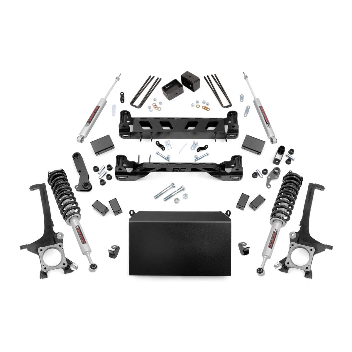 Take your Toyota Tundra to the next level with Rough Country's 6in Suspension Lift for 07 and up models. With heavy-duty components and a high-clearance design, this kit offers aggressive looks, unparalleled off-road performance, and enough ride height to run up to 35in tires.Instantly gain a meaner lifted and level stance with high-quality equipment that's made to handle the hazards of high-performance while withstanding the test of time. A set of durable lifted knuckles, high-clearance front and rear crossmembers, upper strut spacers, and long-lasting, fabricated rear blocks give you plenty of lift and uncompromised toughness.This all-inclusive kit features everything you need to take your Tundra off the tread and through the trenches; featuring steering stops, brake line brackets, differential drop brackets, sway-bar drop brackets, and anything else one would need to keep everything working at optimum angles after lifting. Best of all, you can get up and running with Rough Country's 6in Toyota Tundra Lift at a price that won't break the bank!Features:Unmatched ground clearance due to high clearance crossmember design100 percent precision laser cut materials used in latest computer aided design processLevels the front with the rear of the vehicleWill work with factory 18-inch or larger wheelsRequires no modification to the stock differential mounts, drivetrain or exhaustLifted front struts help maintain smooth, factory-like rideFront struts are structurally engineered for lifted applicationsFront struts are lifted 6-inches, eliminating the need for strut spacersFabricated blocks are stronger and offer a longer lifespan than cast blocksNotes:Does Not fit Pro Series modelsDoes Not fit Rock Warrior modelsDoes Not fit XSP-X modelsMinor cutting and drilling is requiredRequires 18-inch or larger wheelsStock 18-inch or larger wheels can be used but can accommodate tires no wider than 11.5-inchIn some cases minor trimming may be needed to clear 35-inch tiresPlease view instructions for complete information on proper tire, wheel combinationsDetails:Sold As KitDrive 2WD|4WDMax Tire 35.0 inchLift Height 6.0 inchFront Components Lifted knuckles N3 Lifted Struts Front crossmember Rear crossmember Steering stops Brake line brackets Differential drop brackets Bumpstop brackets Sway-bar brackets Lower skid plate HardwareRear Components Fabricated lift blocks U-bolts Brake line brackets Hardware
