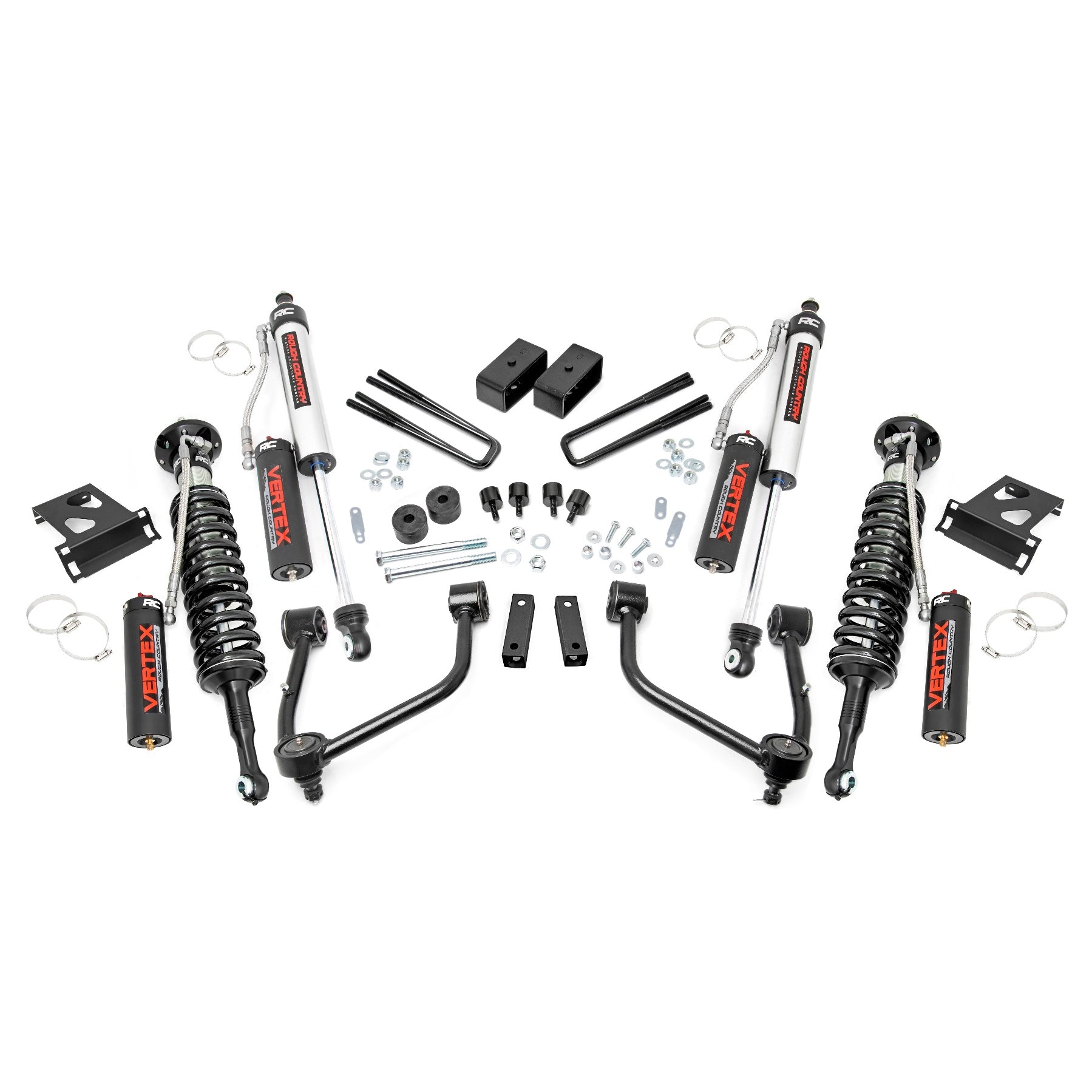 Rough Country's 3.5in Bolt-On Kit offers easy installation and aggressive good looks at an incredible value. Take your truck to new heights with this excellent option for 07-17 Tundra pickups.This kit features a set of high-quality, tubular Upper Control Arms designed to make alignment adjustments easier and Clevite rubber bushings for enhanced durability.These arms are designed to promote a factory-like geometry by keeping the ball joint at optimum angles after lifting. This design allows for an improved, greater range of motion from the ball-joint, with less stress, wear and tear. Rough Country's 3.5-inch Bolt-On Kit features V2 Monotube Nitrogen-charged shocks, giving your truck incredible ride-quality both on and off-road.Also included are a set of durable loaded struts and fabricated rear blocks to provide lift height from front to rear. Once installed, this kit gives your truck plenty of ride height for larger tires while offering a clean, level look from front to rear. This all-inclusive kit comes with everything you need, and installation is a piece of cake compared to other kits on the market!Featuring a 100 percent bolt-on installation process that requires zero cutting or drilling, this kit can be installed using common tools in a home garage, and allows the truck to be returned to stock at any time if so desired. Best of all this kit features Rough Country's Lifetime Replacement Warranty.Features:Easy Bolt-On installationLoaded Struts for easy assemblyNo Cutting or Drilling required!Includes New tubular upper control armsControl arms keep ball joints at optimum angles for less wear and tearControl arms include Clevite rubber bushings for enhanced durabilityIncreased ground clearanceLevels the front and rear of the truckLifetime Replacement WarrantyOptional N3 Loaded Struts:Includes pre-loaded coilMaintains smooth, factory-like rideIncreased ground clearanceEngineered for lifted applicationsInfinitely Variable DampingLeak-proof piston sealMassive 1 3/8in BoreSilver powder coat finish3-year Manufacturer's WarrantyOptional V2 Monotube Shocks:Monotube designInternal floating pistonNitrogen-charged46mm high-flow pistonFast heat dissipation36kN Tensile StrengthMounts invertedT6061 brushed aluminum body3-year Manufacturer's WarrantyOptional Vertex:8-Stage Adjustable DampingMonotube DesignNitrogen-chargedMassive 2.5in Piston22mm Chrome-Hardened Piston Rod3-Stage Seal SystemHeat-Treated, Alloy BearingHoned Steel Body3-year Manufacturer's WarrantyNotes:Does not fit TRD Pro, Rock Warrior, or XSP-X models