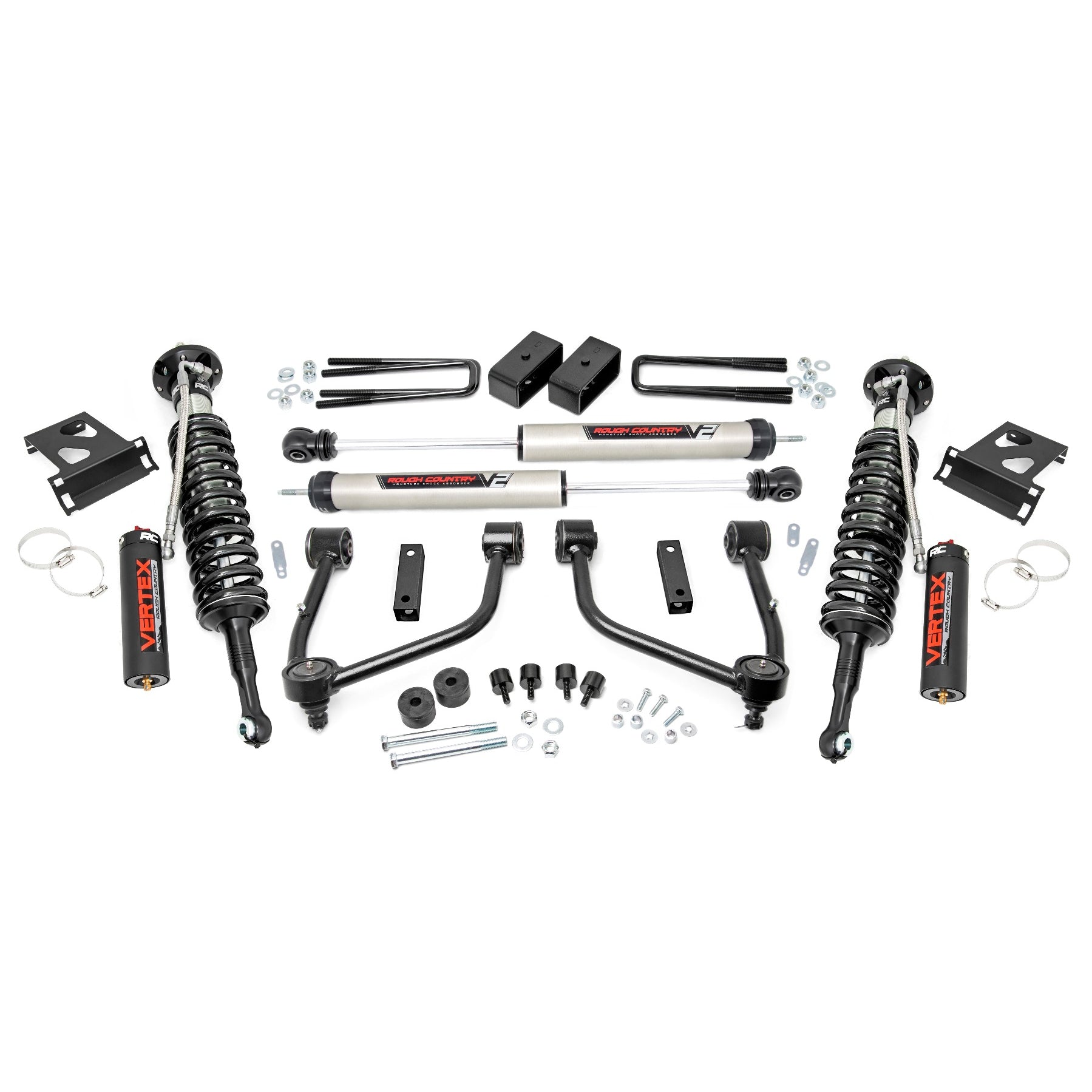 Rough Country's 3.5in Bolt-On Kit offers easy installation and aggressive good looks at an incredible value. Take your truck to new heights with this excellent option for 07-17 Tundra pickups.This kit features a set of high-quality, tubular Upper Control Arms designed to make alignment adjustments easier and Clevite rubber bushings for enhanced durability.These arms are designed to promote a factory-like geometry by keeping the ball joint at optimum angles after lifting. This design allows for an improved, greater range of motion from the ball-joint, with less stress, wear and tear. Rough Country's 3.5-inch Bolt-On Kit features V2 Monotube Nitrogen-charged shocks, giving your truck incredible ride-quality both on and off-road.Also included are a set of durable loaded struts and fabricated rear blocks to provide lift height from front to rear. Once installed, this kit gives your truck plenty of ride height for larger tires while offering a clean, level look from front to rear. This all-inclusive kit comes with everything you need, and installation is a piece of cake compared to other kits on the market!Featuring a 100 percent bolt-on installation process that requires zero cutting or drilling, this kit can be installed using common tools in a home garage, and allows the truck to be returned to stock at any time if so desired. Best of all this kit features Rough Country's Lifetime Replacement Warranty.Features:Easy Bolt-On installationLoaded Struts for easy assemblyNo Cutting or Drilling required!Includes New tubular upper control armsControl arms keep ball joints at optimum angles for less wear and tearControl arms include Clevite rubber bushings for enhanced durabilityIncreased ground clearanceLevels the front and rear of the truckLifetime Replacement WarrantyOptional N3 Loaded Struts:Includes pre-loaded coilMaintains smooth, factory-like rideIncreased ground clearanceEngineered for lifted applicationsInfinitely Variable DampingLeak-proof piston sealMassive 1 3/8in BoreSilver powder coat finish3-year Manufacturer's WarrantyOptional V2 Monotube Shocks:Monotube designInternal floating pistonNitrogen-charged46mm high-flow pistonFast heat dissipation36kN Tensile StrengthMounts invertedT6061 brushed aluminum body3-year Manufacturer's WarrantyOptional Vertex:8-Stage Adjustable DampingMonotube DesignNitrogen-chargedMassive 2.5in Piston22mm Chrome-Hardened Piston Rod3-Stage Seal SystemHeat-Treated, Alloy BearingHoned Steel Body3-year Manufacturer's WarrantyNotes:Does not fit TRD Pro, Rock Warrior, or XSP-X modelsFits:2007-2021 Toyota Tundra