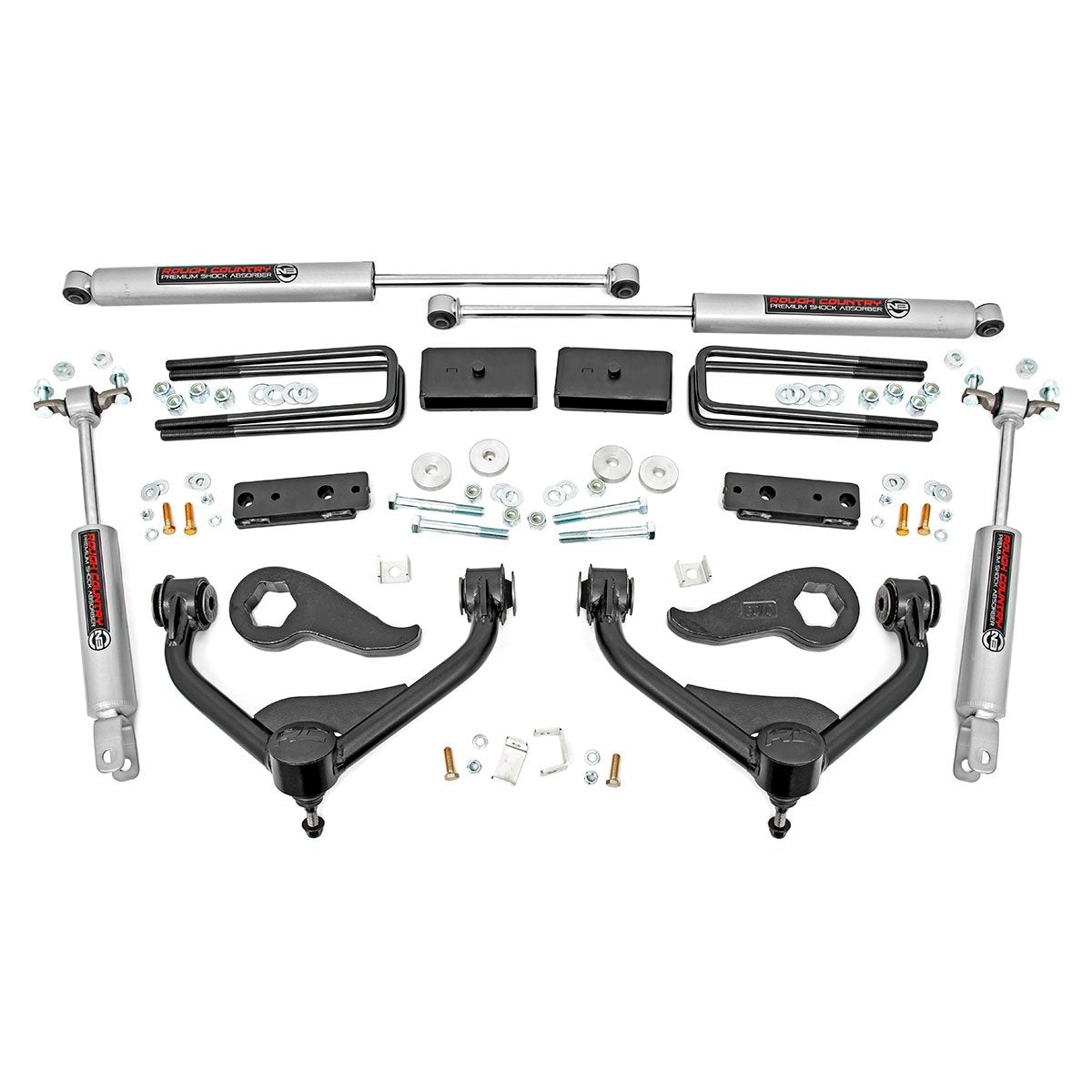 Rough Country's 3in Bolt-On Kit offers easy installation and aggressive good looks at an incredible value. Take your truck to new heights with this excellent option for GM HD Models. This kit features a set of high-quality, tubular Upper Control Arms with Clevite rubber bushings for enhanced durability.These arms are designed to promote a factory-like geometry by keeping the ball joint at optimum angles after lifting. This design allows for an improved, full range of motion from the ball-joint, with less stress, wear and tear.This kit also features a set of durable, forged torsion bar keys, offering uncompromising strength and rigidity over factory keys. A set of front and rear N3 Nitrogen-charged shocks are also included in the kit, giving your truck incredible ride-quality both on and off-road. Once installed, this kit gives your truck plenty of ride height for up to larger tires while offering a clean, level look from front to rear.This all-inclusive kit comes with everything you need, and installation is a piece of cake compared to other kits on the market! Featuring a 100 percent bolt-on installation process that requires zero cutting or drilling, this kit can give your truck a huge transformation while preserving the ability to return to stock if needed. Best of all this kit features Rough Country's Lifetime Replacement Warranty!Features:Easy bolt-on installation No cutting, drilling or weldingIncreased ground clearanceLevels the front with the rear of the vehicleTorsion bar keys are forged for uncompromised strengthKeys are indexed to Not stress OE componentsUpper control arms help maintain factory-like geometry while keeping a full range of motionUpper control arms feature OEM style Clevite rubber bushingsIncludes application valved N3 series shock absorbers which offer the best in balanced performance for on and off-road use.Notes:Does Not fit models with rear overload springsDoes Not fit models with Magnetic Ride ControlDetails:Sold As KitDrive 4WDTire Info 285/75 R18:Factory 18:-- 35x12.50 R20:20x9:-:0mm to +20mmLift Height 3.0 inchMount Style Bolt OnFront Components Forged torsion bar adjuster keys Upper control arms Differential spacersRear Components Lift Blocks U-bolts Hardware
