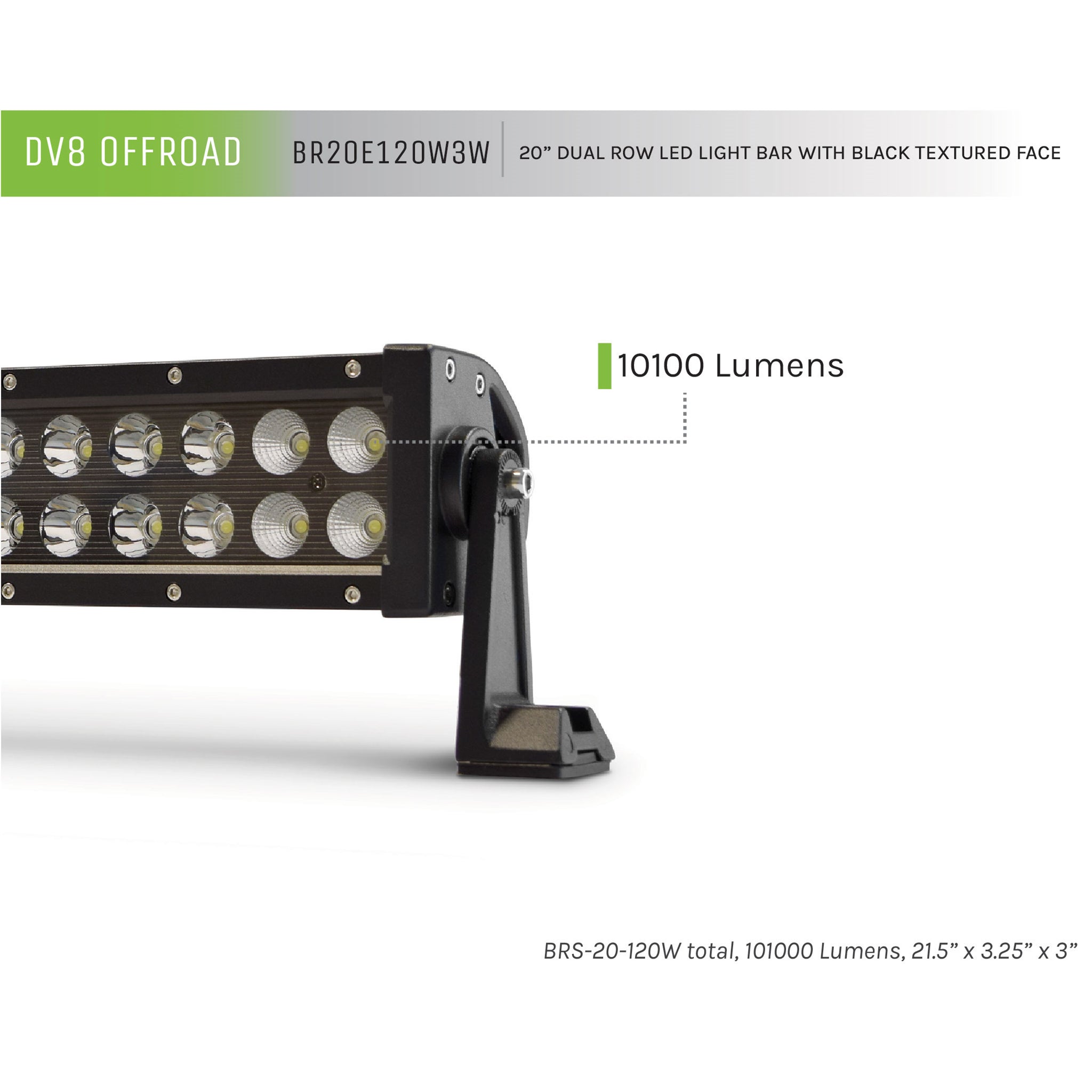 Description_MKT | DV8 Optical Technology and cutting edge design delivers unparalleled light output. These pro lights have a black textured face, polycarbonate lens, are IP68 rated, with 3W Cree LED's rated to 50,000 hours and have side and bottom mounts. Details: 20 inch Light Bar Black, Flood/Spot, 120W total, 10100 Lumens, 21.5 inch x 3.25 inch x 3 inch. |