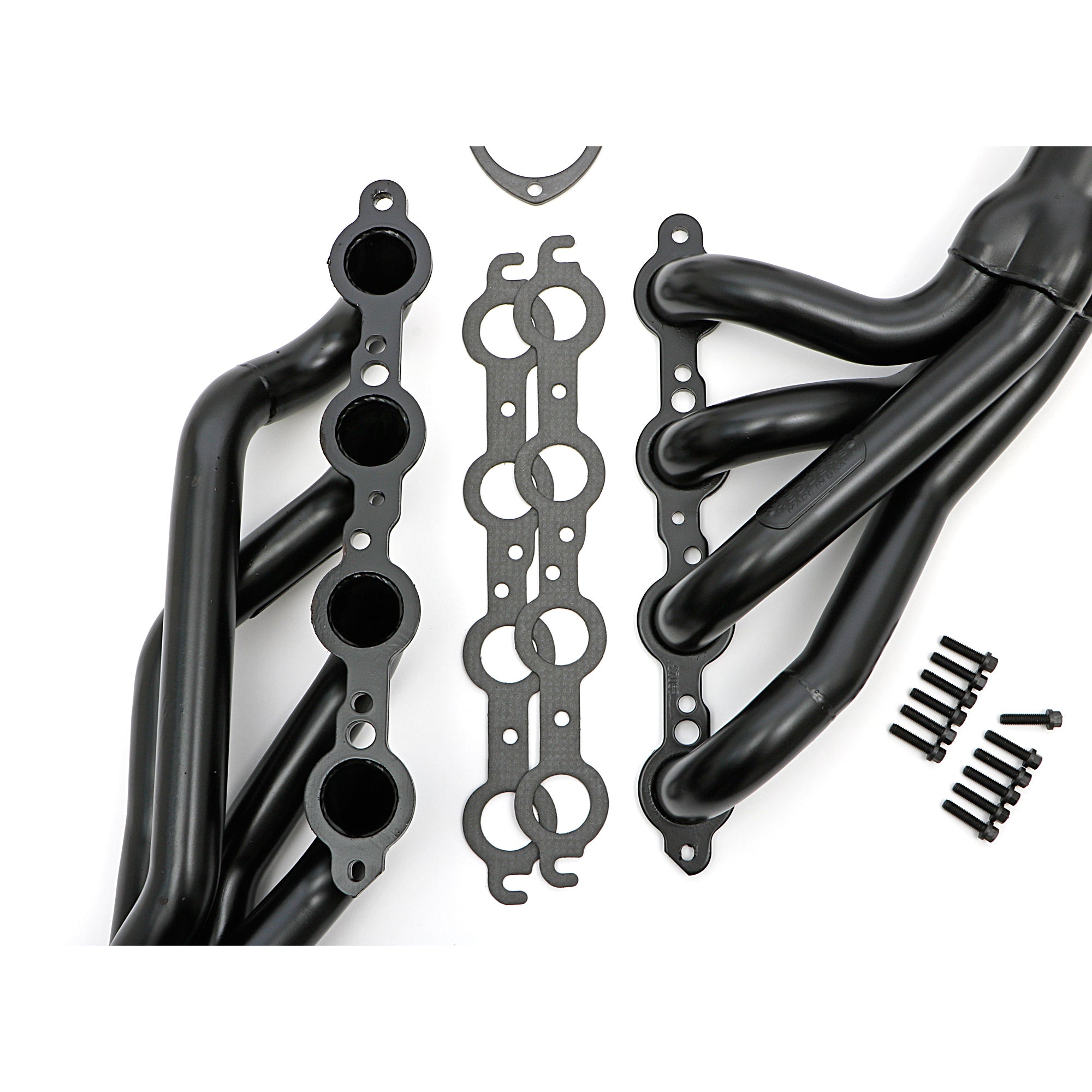 Built from mild steel material and handcrafted in Hedman's Whittier, California manufacturing plant, these headers come complete with gaskets, small head header bolts, and exhaust collector adapter for attaching the headers to a 2-1/2" exhaust system. This uncoated set ships from the factory with a temporary black paint to protect the headers from corrosion before arriving to you, but they are also available with Hedman's HTC polished silver ceramic-metallic, or Black-Maxx satin black ceramic-metallic finishes.
