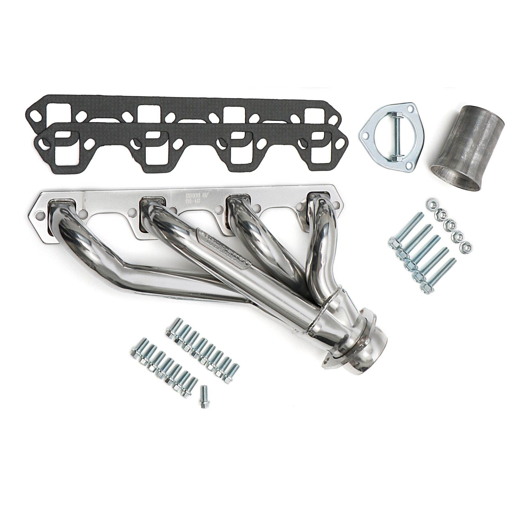 Contents | Header(s), new bolts, gasket(s) to head, reducer(s) and hardware, instructions |