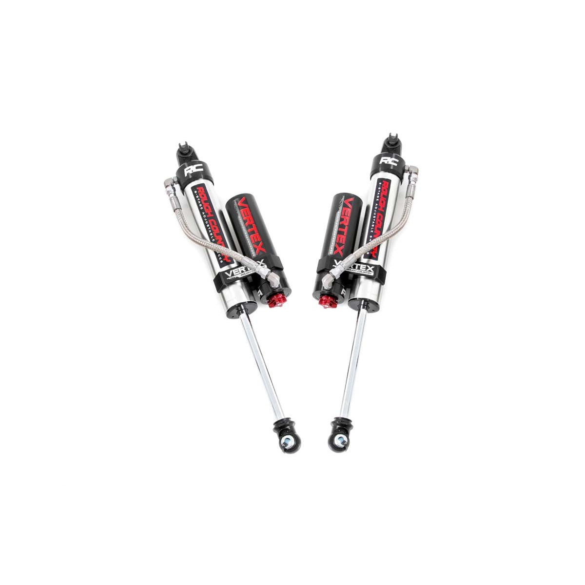 Behold: The pinnacle of off-road performance and smooth ride quality in an affordable package has arrived with Rough Country's 2.5 Vertex 8-Stage Adjustable Reservoir Shocks.These high-performance reservoir shocks offer an elite ride-quality in every situation you face, with an 8-stage adjustable damping system that lets you perfectly dial-in your ride for whatever lies ahead.Whether you want a smooth ride for city streets or the ultimate damping for off-road mayhem, a quick spin of the dial lets you adjust each shock to the exact performance specifications you desire.Rough Country's Nitrogen-charged Vertex Shocks feature a monotube design with an external reservoir for increased oil capacity and damping sensitivity. Each shock features a massive 2.5in diameter piston and a high-flow 22mm chrome hardened piston rod that simply dwarfs the competition.When it comes to investing in a high-end shock, you'll be pleased to find that Rough Country's 2.5in piston design is beefier and offers an impressive 56 percent greater fluid capacity than the average reservoir shock.A 3-stage, fortified seal system ensures your Vertex shocks keep kicking while the beautifully designed honed steel body offers a long lifespan of reliable performance and killer good looks.This shock is designed to be a true eye-catcher, with a beautiful silver finish, laser-etched RC logo, matching Vertex decals, and CNC-machined Billet Aluminum accents. Rear shocks feature a durable bracket system with laser-etched logo and a premium braided steel reservoir line. Includes an Industry-leading 3-year Warranty!Features: Includes driver and passenger side rear shocks8-Stage Adjustable DampingMonotube DesignNitrogen-ChargedRemote Reservoir with Steel Braided Reservoir LineMassive 2.5in Piston20mm Chrome-Hardened Piston RodSpecifically Tuned for Each Application3-Stage Seal SystemHeat-Treated, Alloy BearingHoned Steel BodyCNC-Machined Billet Aluminum AccentsZinc Plate Finish with Double Clear CoatIncredible 400 Hour Salt Spray Rating3-year Manufacturer's WarrantyNotes: Onlyworks with Rough Country 4in Long Arm Lift KitsDetails:Sold As EachFinish Zinc PlateLocation RearDoors 2 Door|4 DoorDrive 2WD|4WDLift Height 4.0 inch